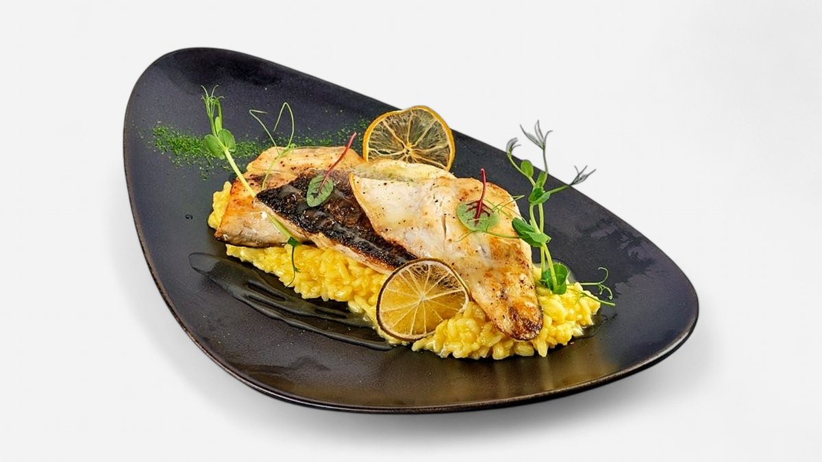 лаврак на плоча, поднесен с кремообразно лимоново ризото, 350г