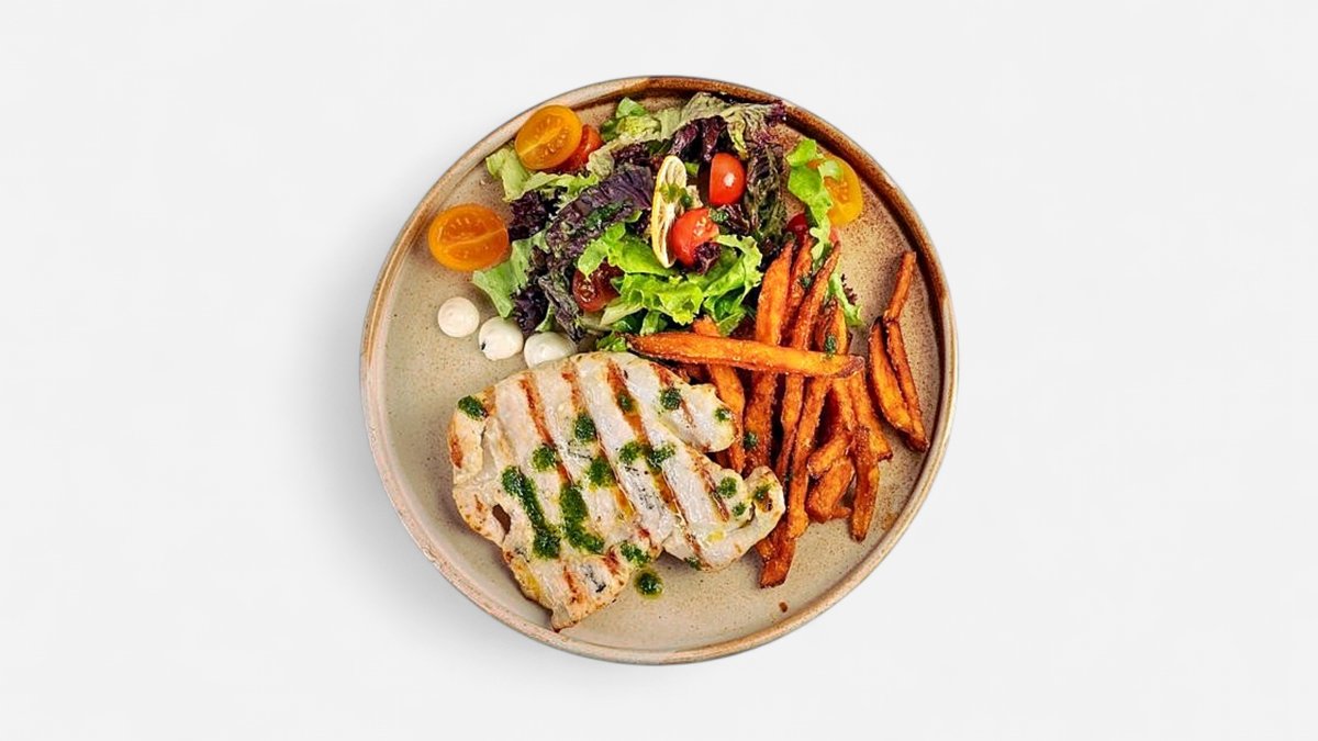 филе сьомга, зеленчуков дресинг, сметанов сос с горгонзола и моцарела, поднесена със сладки картофи и майонезено-чеснов айоли, 400г
