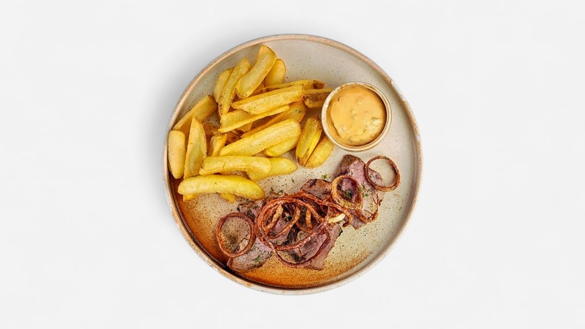 сочен свински стек с гарнитура от картофки и хрупкав лук, 350г