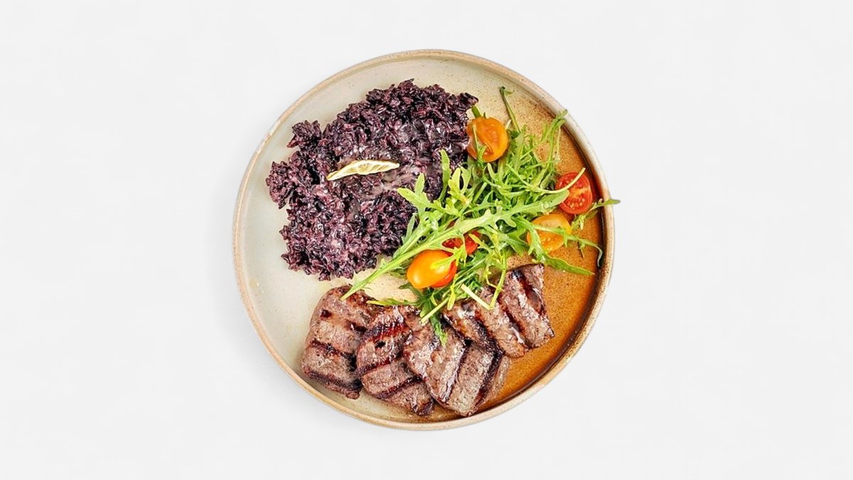 гриловано филе с кремообразен сос и черно ризото, 380г