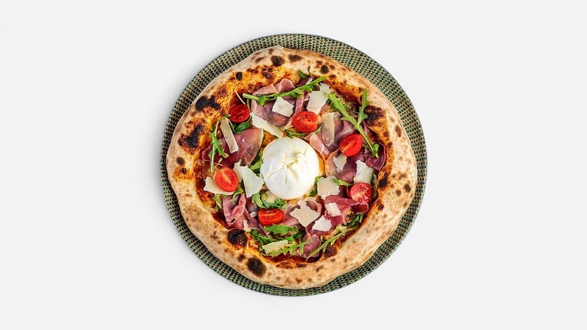 италианска класика с кремообразна бурата, фино прошуто крудо, ароматен пармезан, свеж босилек и сочни чери домати – съвършен баланс между вкус и текстура, 400г, 30см
