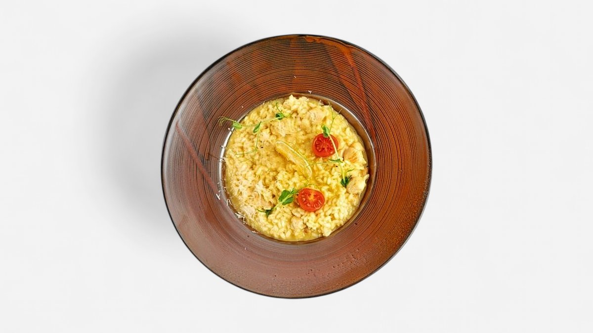 нежно ризото с пилешко, лимонов дресинг и лек аромат на шафран, 300г