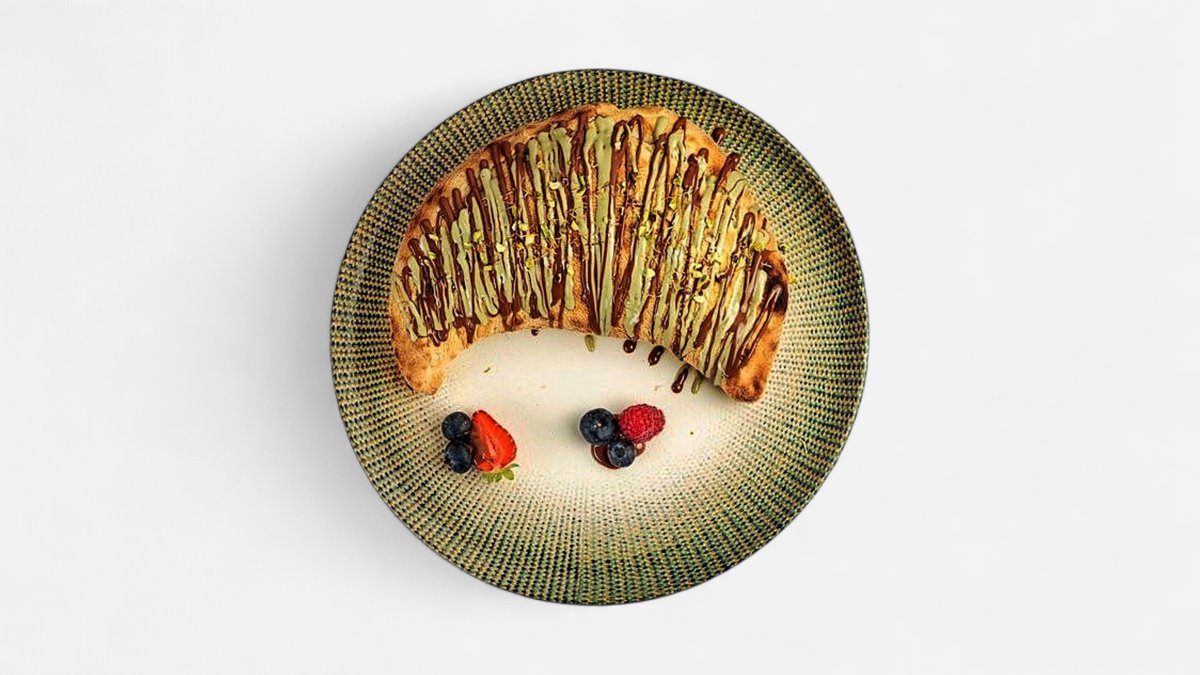 пухкаво калцоне, пълнено с крем и покрито с шоколадови нишки и плодове