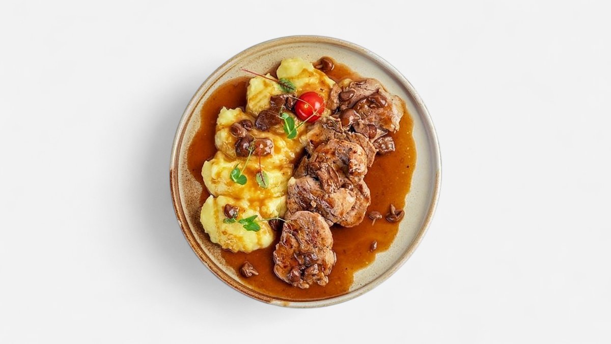 свински медальони със сотирани гъби и картофи с билки, 350г