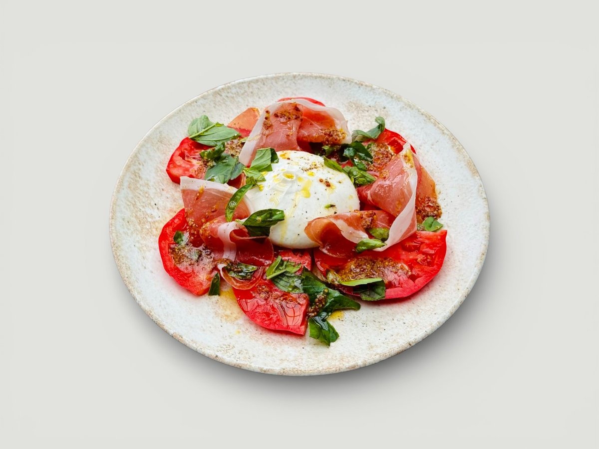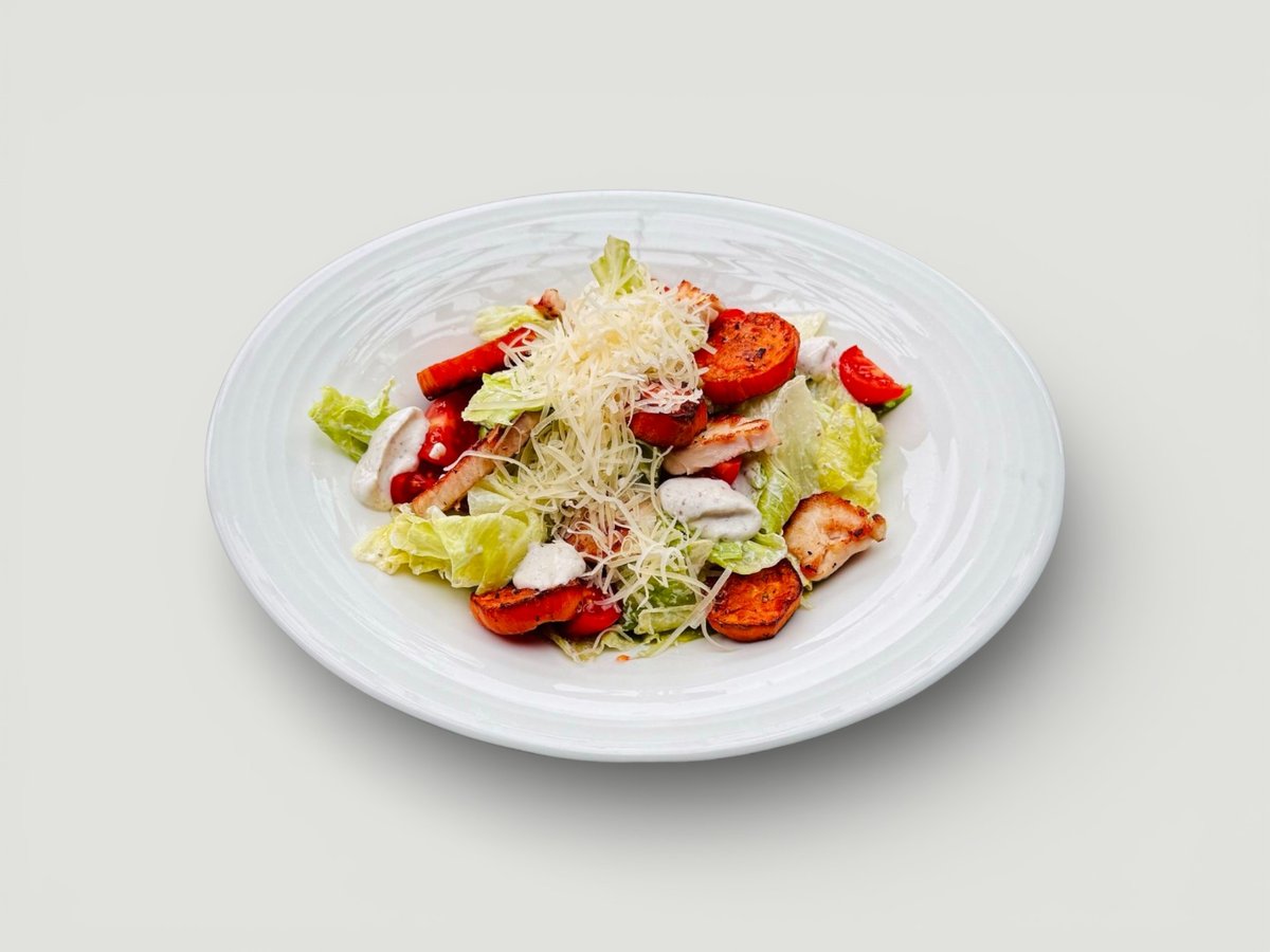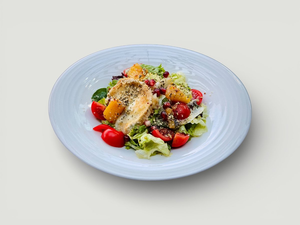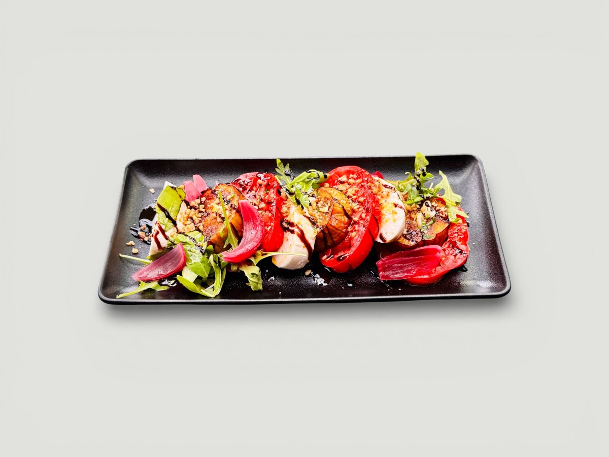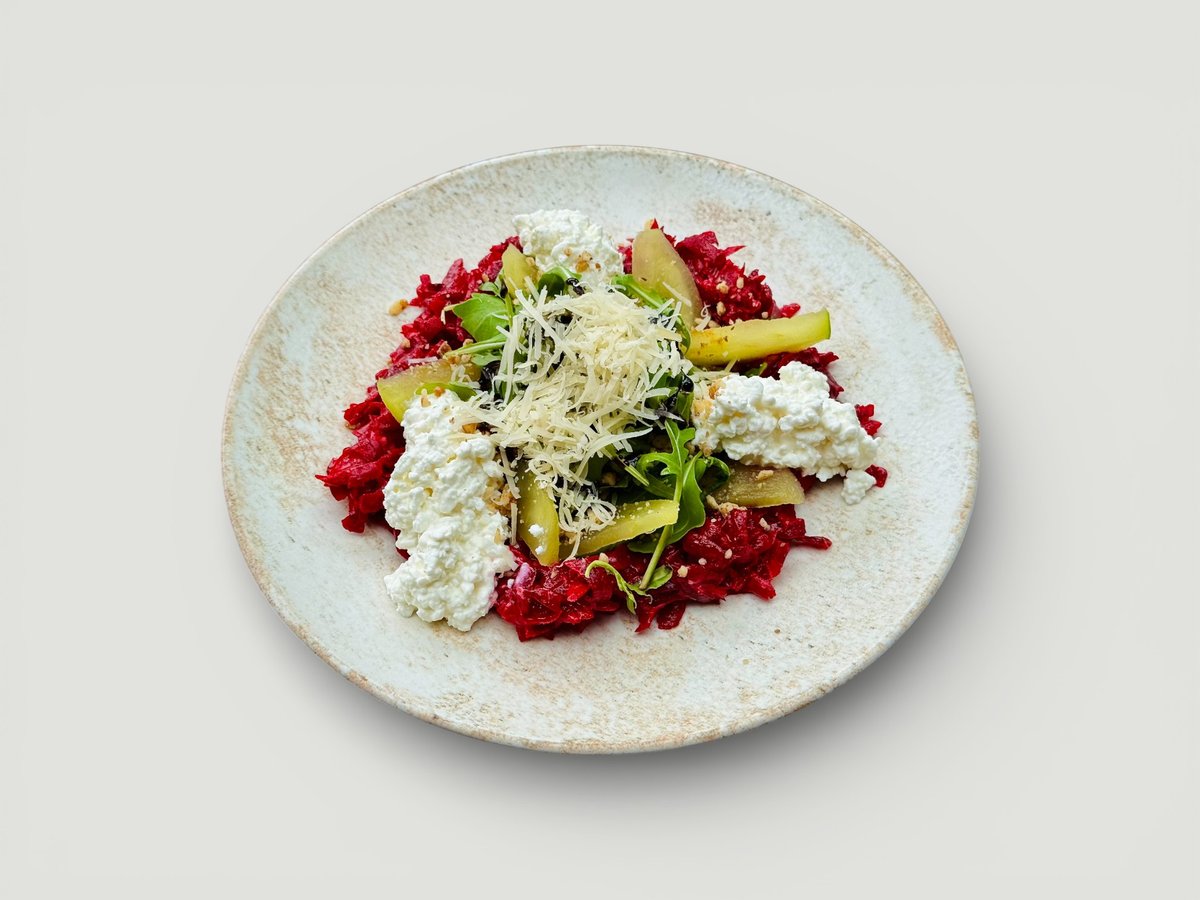 Салата от конфитирани кореноплодни, рукола, котидж сирене, поширана ябълка, орехи и пармезан