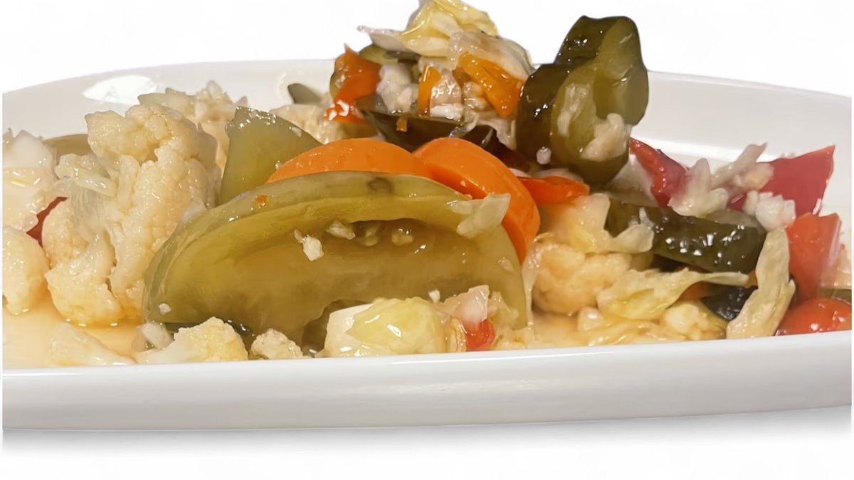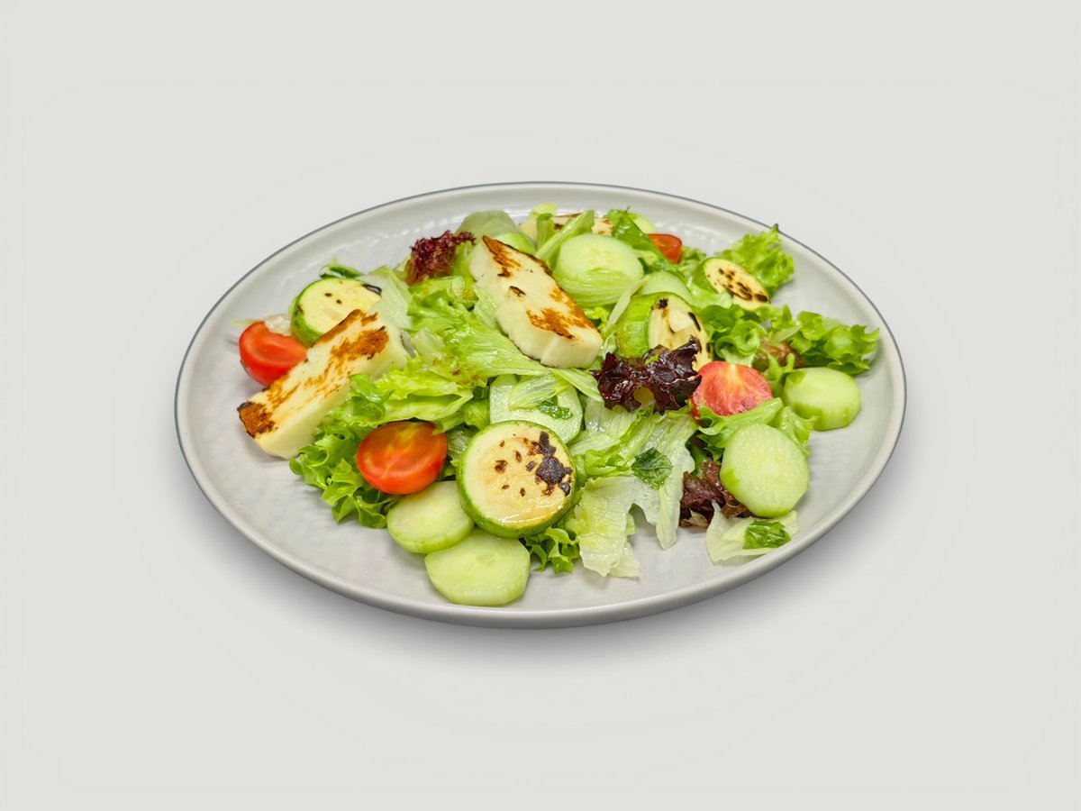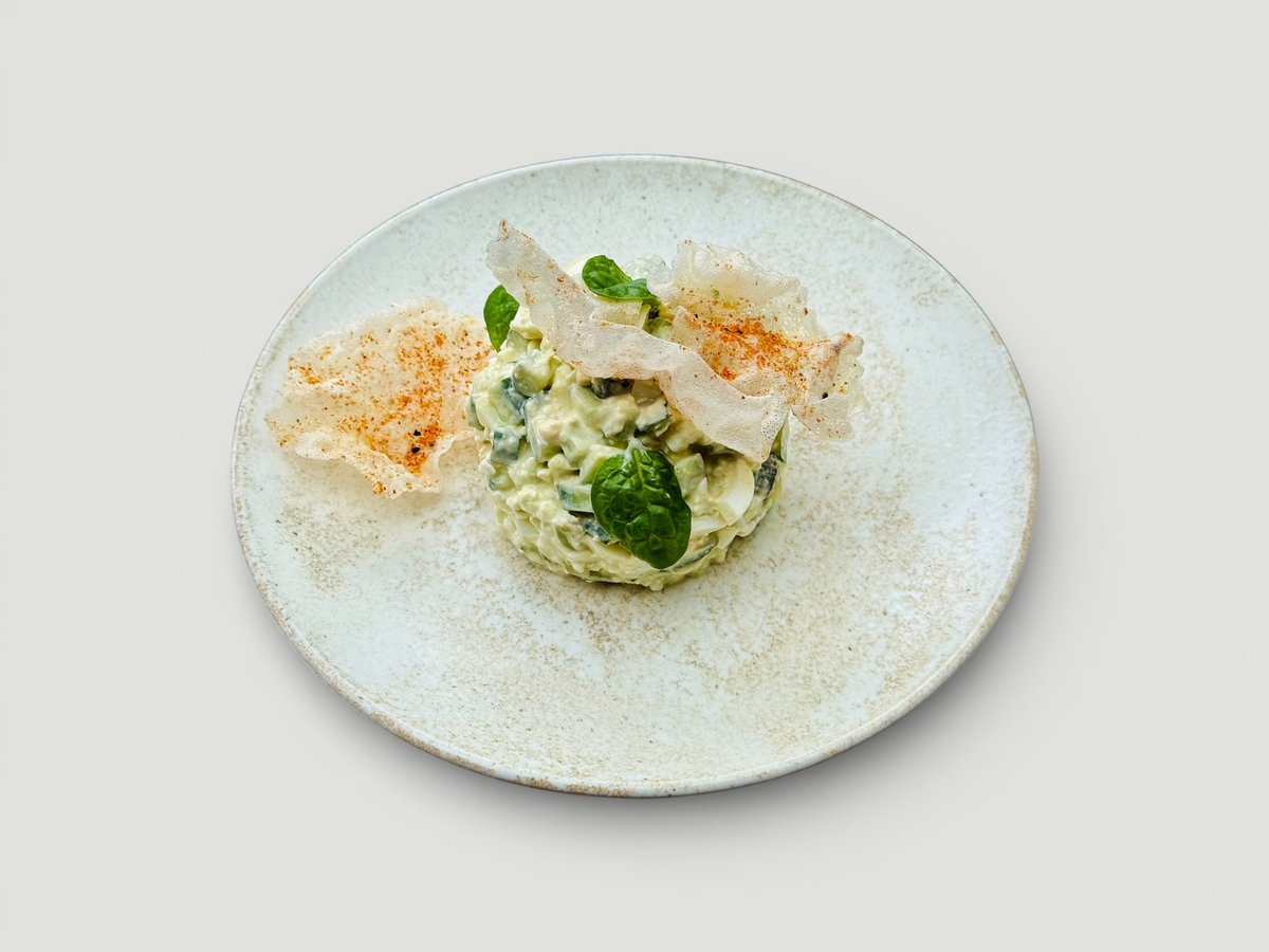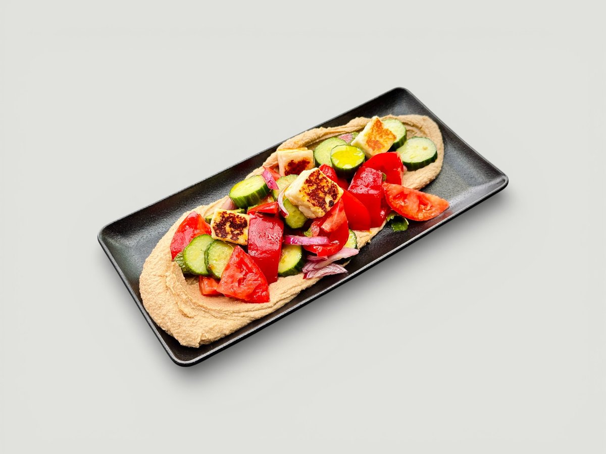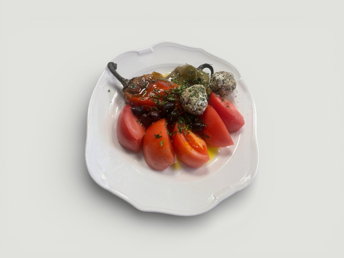Салата от конфитирани кореноплодни, рукола, котидж сирене, поширана ябълка, орехи и пармезан