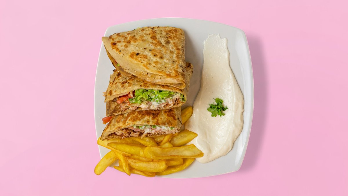 (маруля, домат, кисели краставички, пържени картофи) пилешкият шаурма е близкоизточно ястие, приготвено от мариновано, тънко нарязано пилешко месо, сервирано със зеленчуци, хумус и таханов сос, увити в топъл лаваш, 100% халал + Coca-Cola.