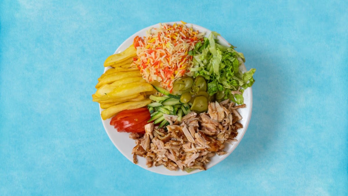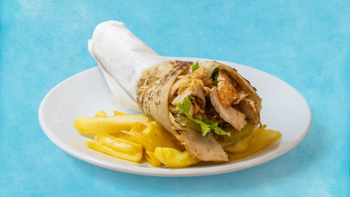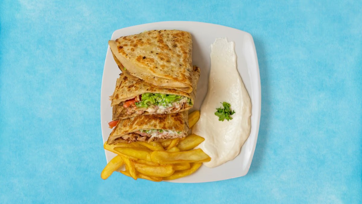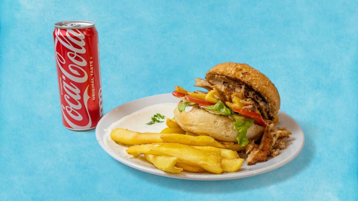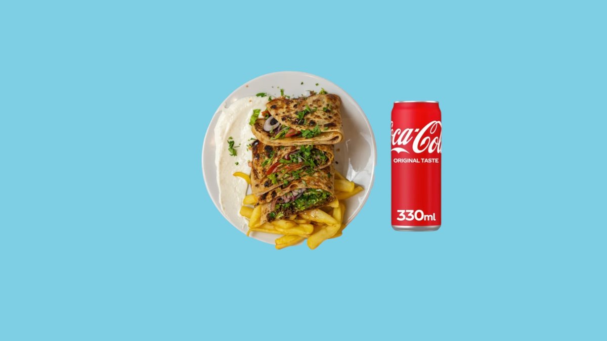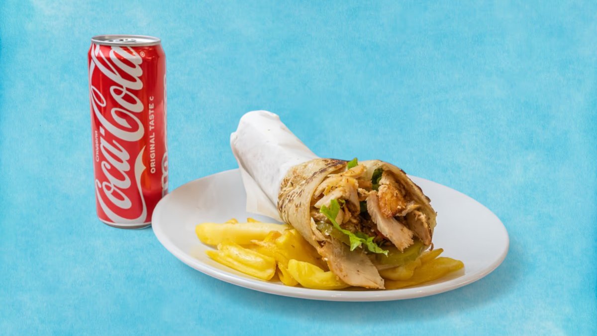 (маруля, домат, кисели краставички, пържени картофи) пилешкият шаурма е близкоизточно ястие, приготвено от мариновано, тънко нарязано пилешко месо, сервирано със зеленчуци, хумус и таханов сос, увити в топъл лаваш, 100% халал + Coca-Cola.