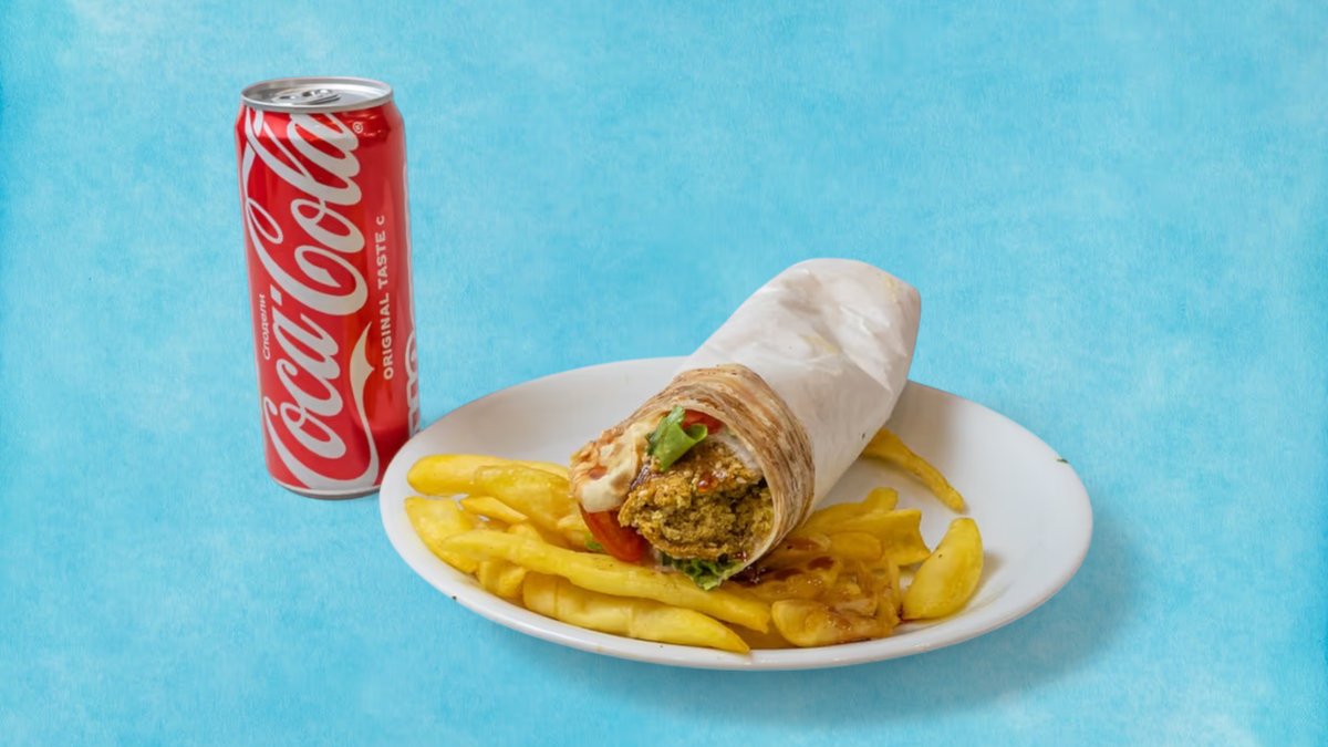 фалафел дюнерът е вкусен вегетариански wrap, пълен с хрупкави фалафел кюфтенца, свежи салати и ароматни сосове, увити в меко питка. перфектен избор за апетитно безмесно хапване + Coca-Cola.