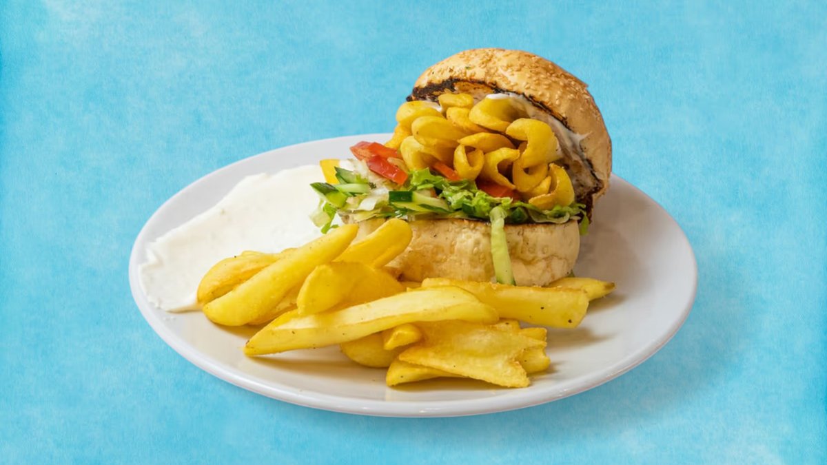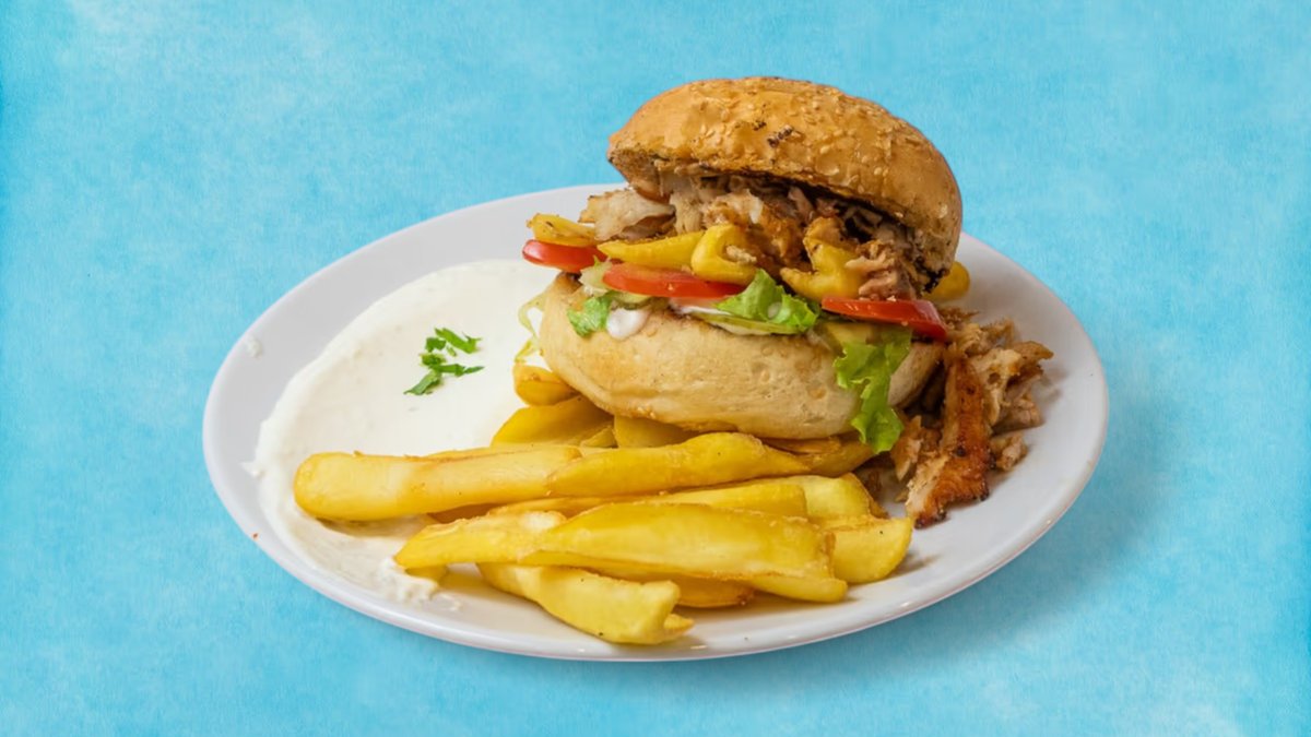 пилешкият шаурма бургер е вкусен сандвич, приготвен с мариновано пилешко месо, хрупкава маруля, домати и чеснов сос, всичко това в препечена питка. насладете се на вкусовете на Близкия изток с този сочен и апетитен бургер, 100% халал.