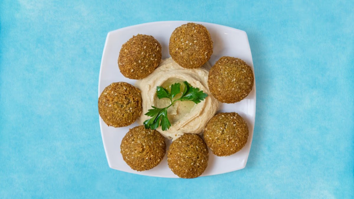 порцията фалафел е популярно близкоизточно ястие, приготвено от смлян нахут, подправки и билки. това е вегетарианско ястие, което е отличен източник на протеини и фибри.