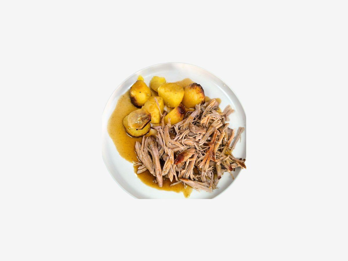 Бавно готвено дърпано свинско с печен сос (BBQ стил). Съставки: Свинска плешка, печен/барбекю сос, лук, подправки, сол