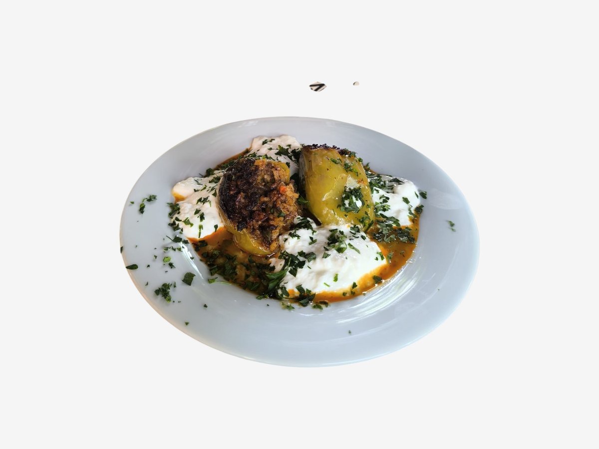 Чушки, пълнени с ориз и кайма, печени до златисто. Съставки: Чушки, смляно месо (смес), ориз, лук, домати, подправки, сол
