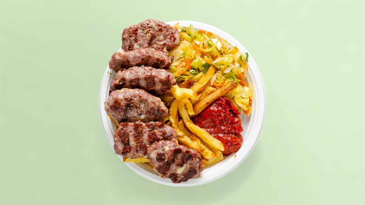 6 броя с гарнитура пържени картофи, зеле с моркови и лютеница 500г