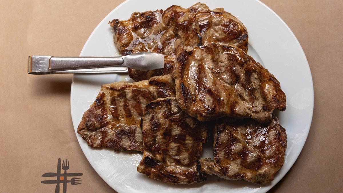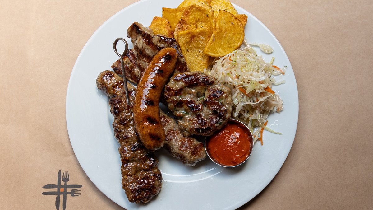 кюфте, кебапче, свинска вратна пържола, свинска наденица, агнешки кебап, телешки бифтек, порция пилешко филе, порция телешки дроб с двойна гарнитура пържени картофи, зеле, моркови и лютеница 1100г