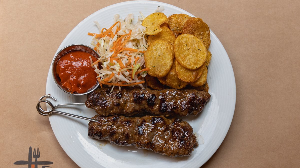 кебап от мляно агнешко месо 2х100г с гарнитура пържени картофи, зеле-моркови и лютеница 200г