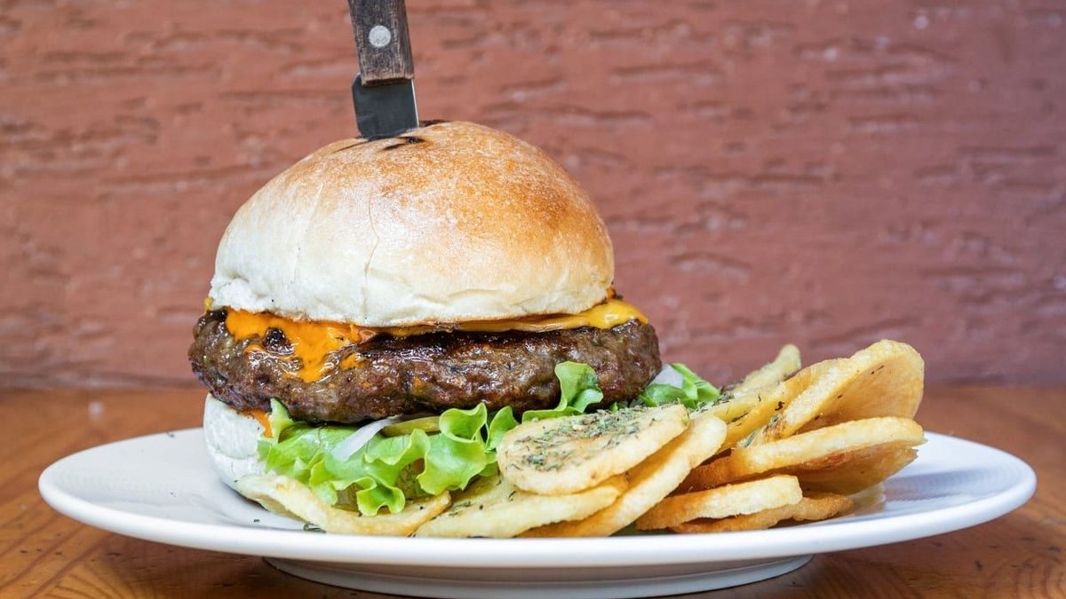 питка, телешки бифтек 250г, чедър, маруля, кисели краставички, лук, домашен сос, гарнитура картофи 500г