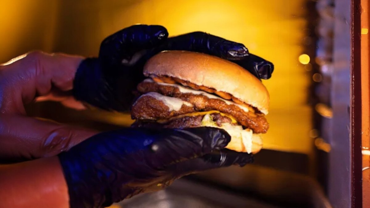 хрупкаво пилешко филе, прясно телешко, чедър слайс, разтопена френска моцарела, лук, айсберг, кисели краставички, микс от коктейл и специалното сосче, 380г