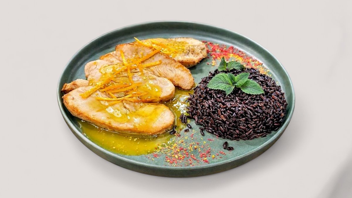 Пуешко фике с императорски ориз със зеленчуци и портокалово-меден сос 400гр