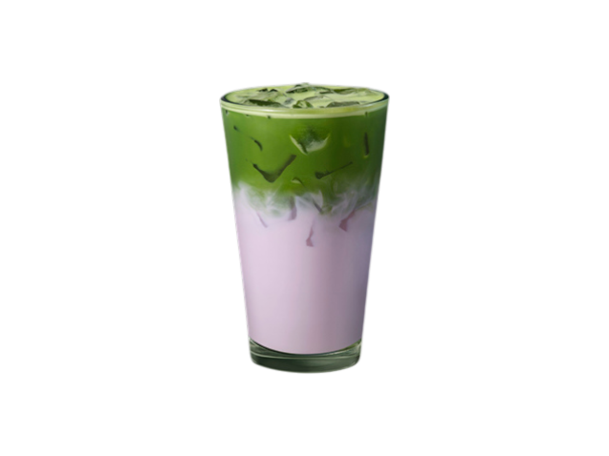 Сосът с вкус на ванилия UBE се смесва с мляко и лед, а отгоре се добавя зелен чай Мача.