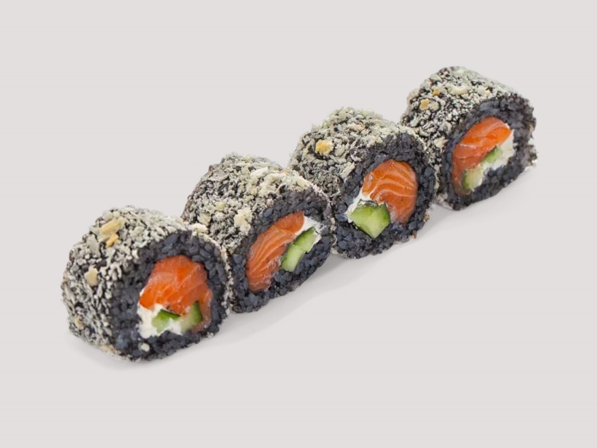Суши Ориз Black, Нори, Филе от Сьомга, Крема сирене"Philadelphia", Краставица, Гарнирано с пикантен сос Срирача Майонеза. Соев сос, Уасаби, Джинджифил 4бр