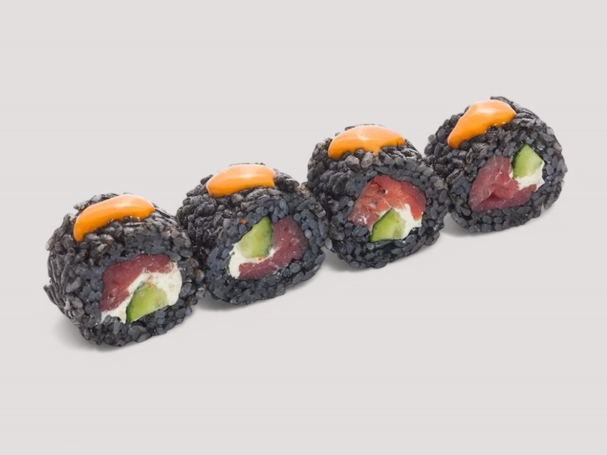 Суши ориз, Нори, Авокадо, крема сирене Филаделфия, покрито с еднакво нарязани филенца от Тон, полято със сос Унаги. Соев сос, Уасаби, Джинджифил 4бр