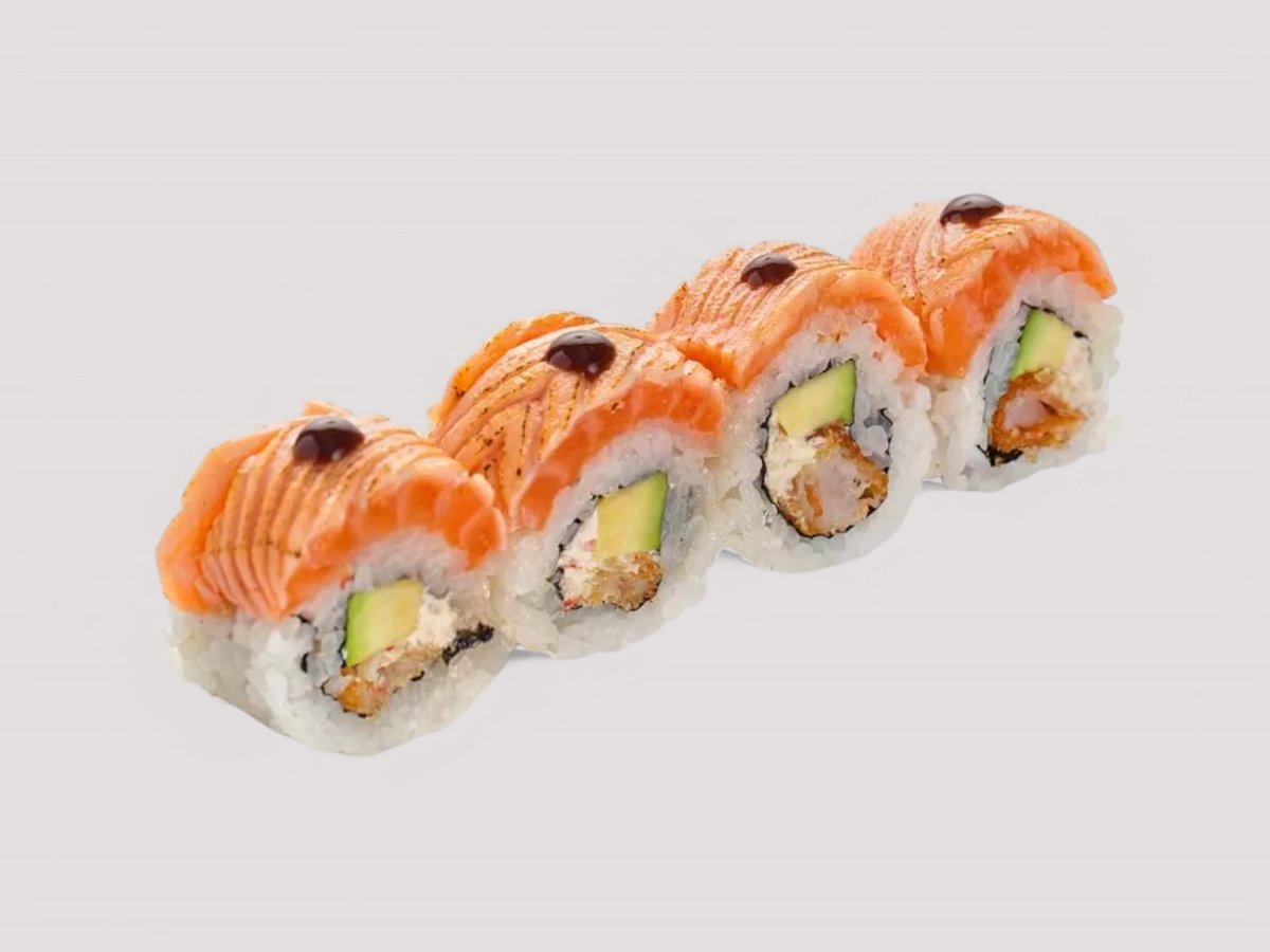Суши ориз, Нори, Авокадо, крема сирене Филаделфия, покрито с еднакво нарязани филенца от Сьомга, полято със сос Унаги. Соев сос, Уасаби, Джинджифил 4бр