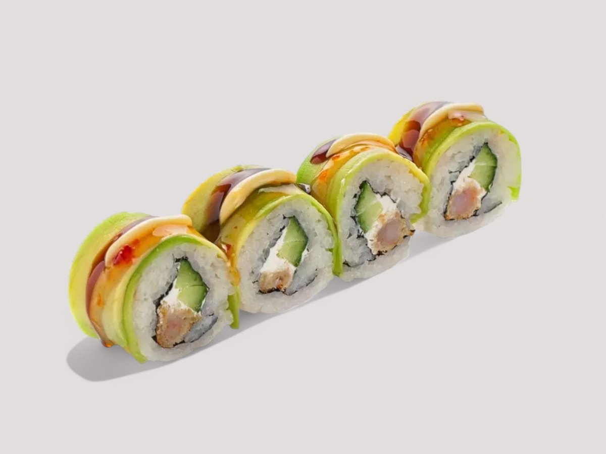 Суши ориз, Нори, Рулца от раци, крема сирене Филаделфия, краставица, покрито с енакви резанчета Авокадо, гарнирано с Японска соева майонеза и полято със сос Терияки. Соев сос, Уасаби, Джинджифил 4бр