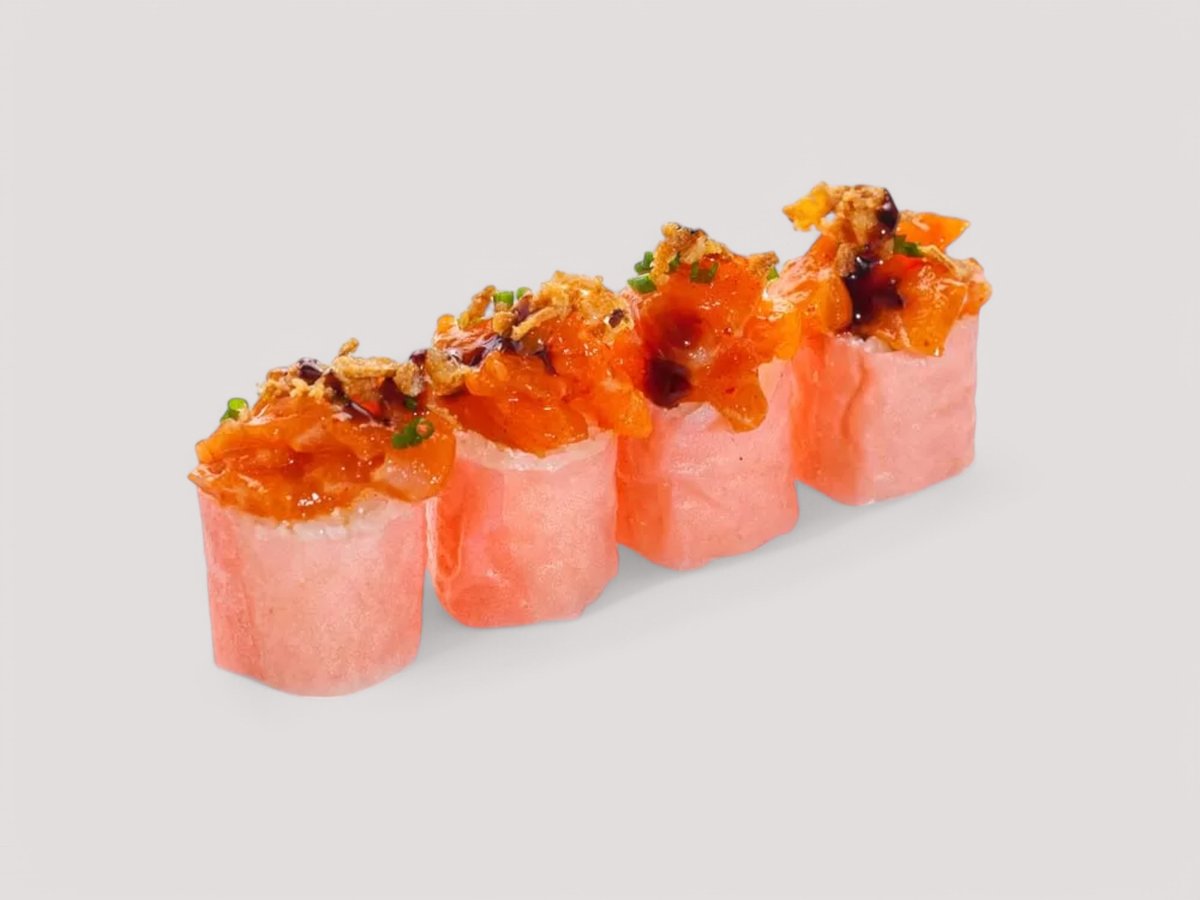 Суши ориз, Нори, Авокадо, крема сирене Филаделфия, покрито с еднакво нарязани филенца от Тон и опърлено, полято със сос Унаги. Соев сос, Уасаби, Джинджифил 4бр