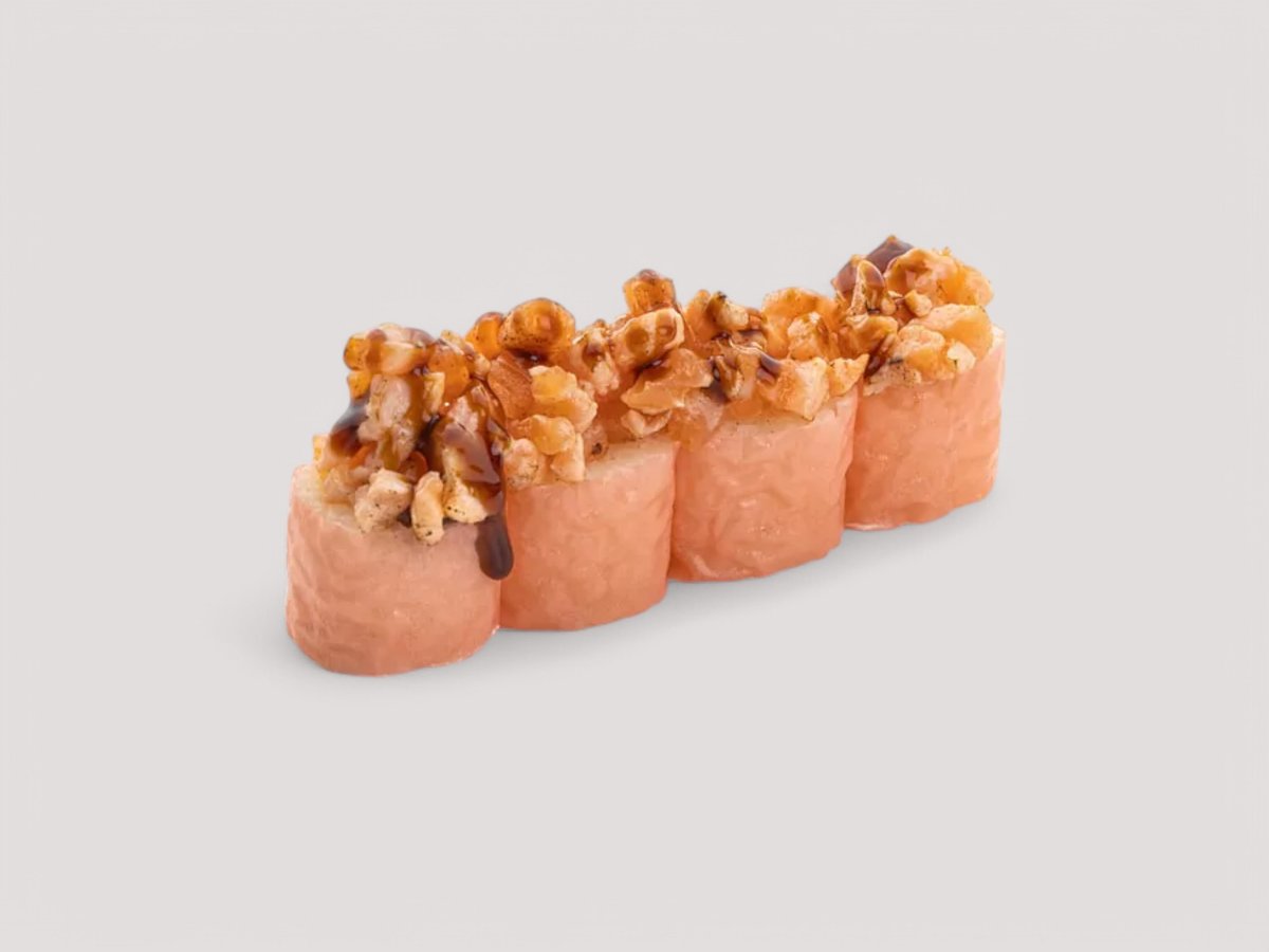 Суши ориз, Нори, Авокадо, крема сирене Филаделфия, покрито с еднакво нарязани филенца от Сьомга и опърлено, полято със сос Унаги. Соев сос, Уасаби, Джинджифил 4бр