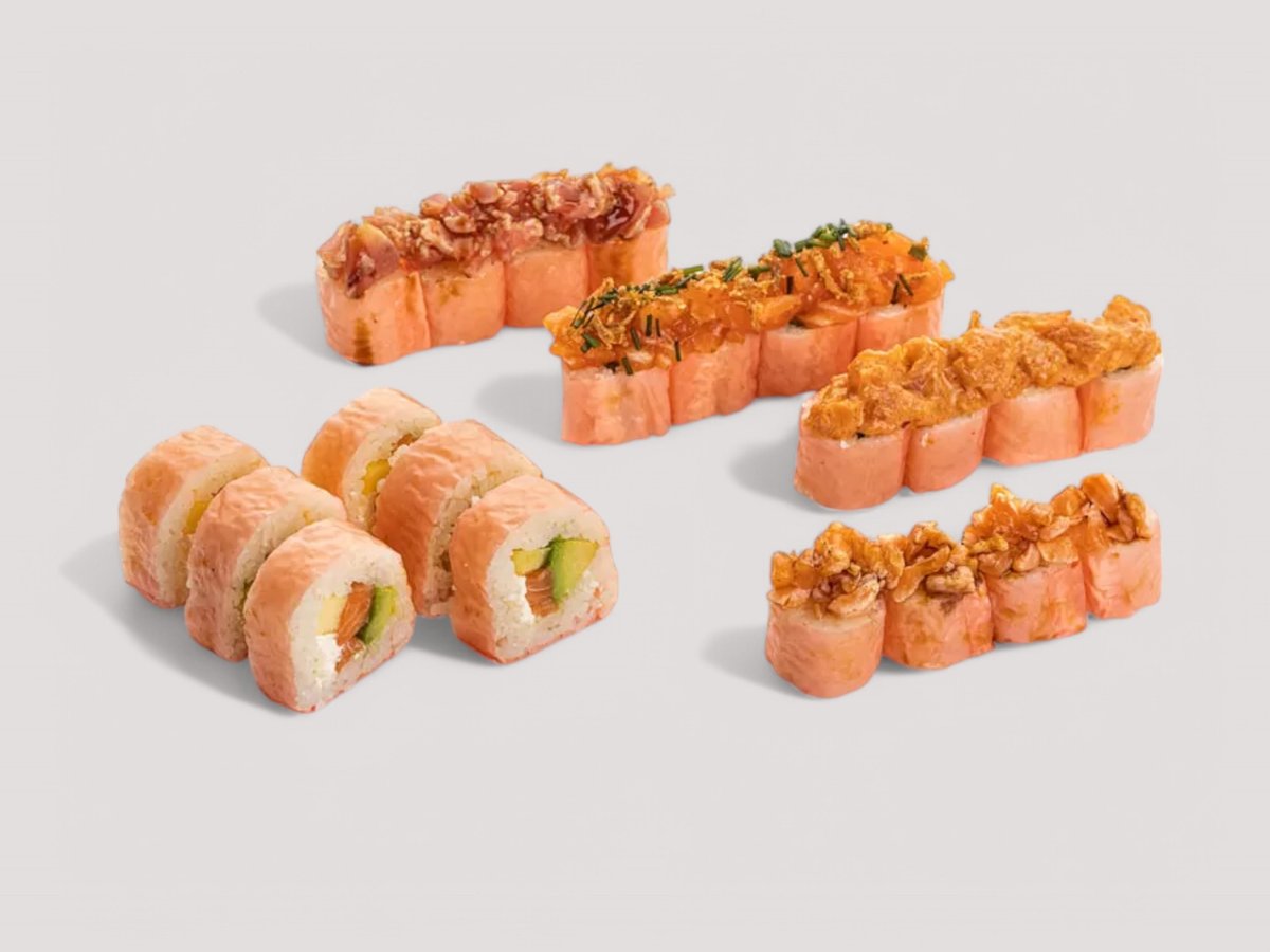 Суши Ориз, Нори, Японски омлет Тамаго, Айсберг, Японска соева майонеза, покрито с еднакво нарязани и опърлени филенца от Сьомга, Тон, и Лаврак, гарнирано с Японска соева майонеза, Унаги сос и сос Дракон, Соев сос, Уасаби и Джинджифил 8бр