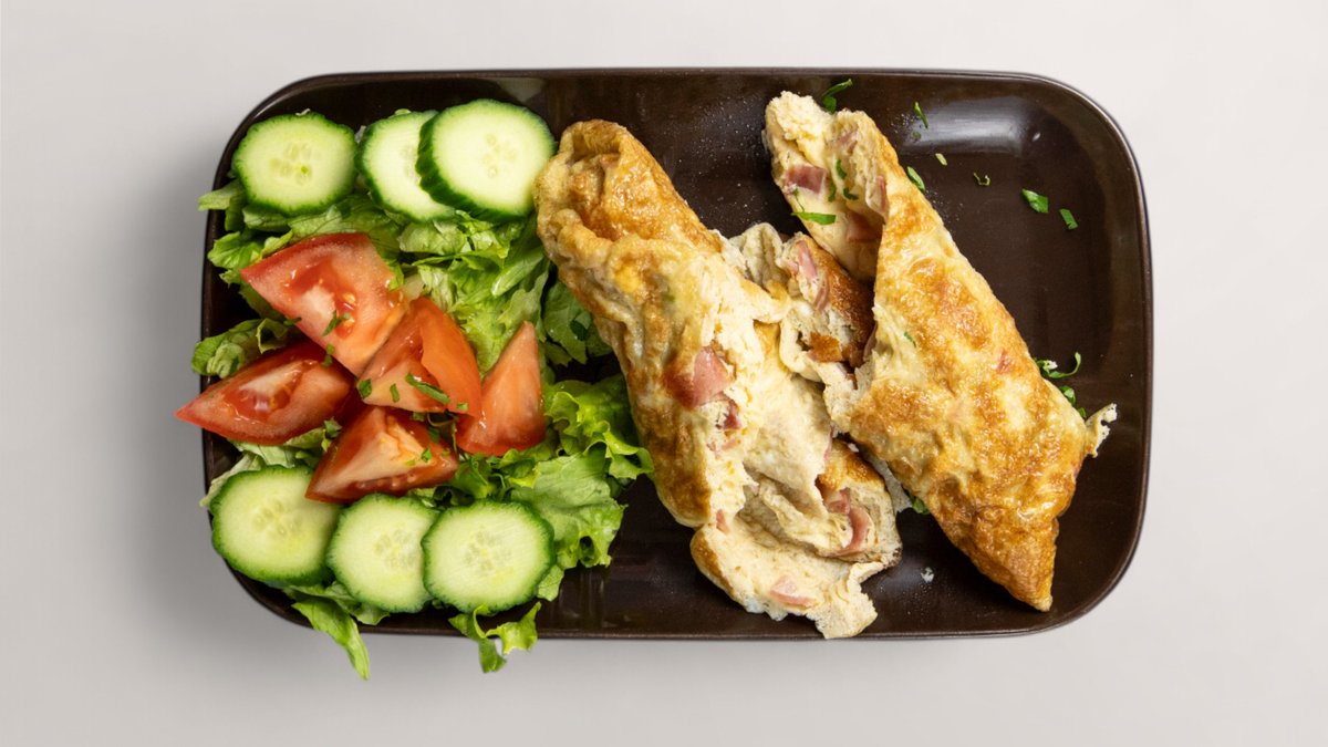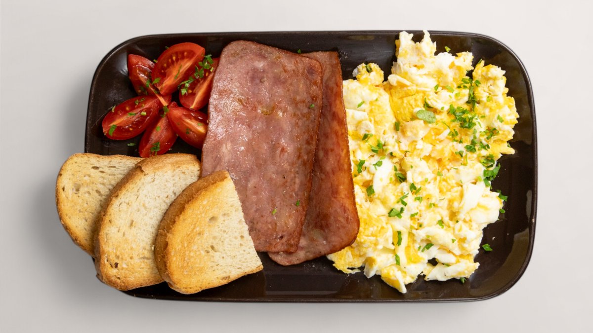 4 бр. бъркани яйца, хрупкав бекон, домати, препечени филийки, пресен магданоз 250 г.