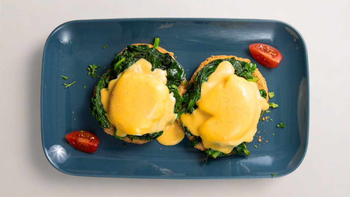 препечени пълнозърнести филийки, поширани яйца, сос Холандез и сотиран спанак 250 г.