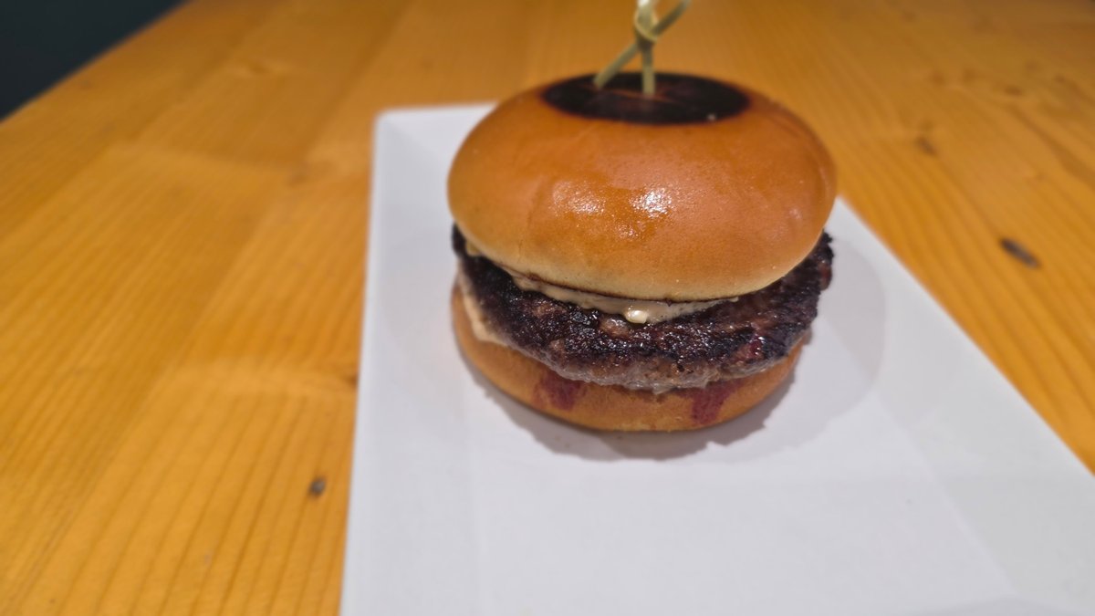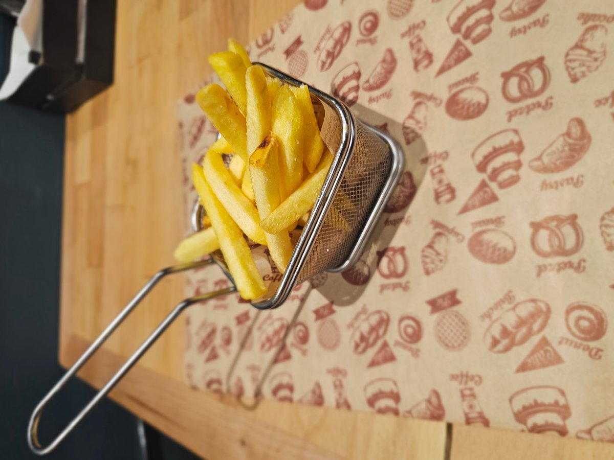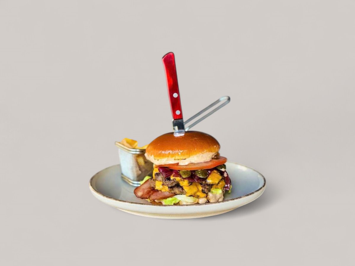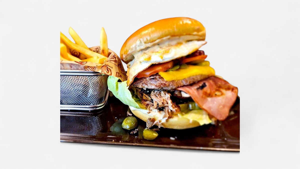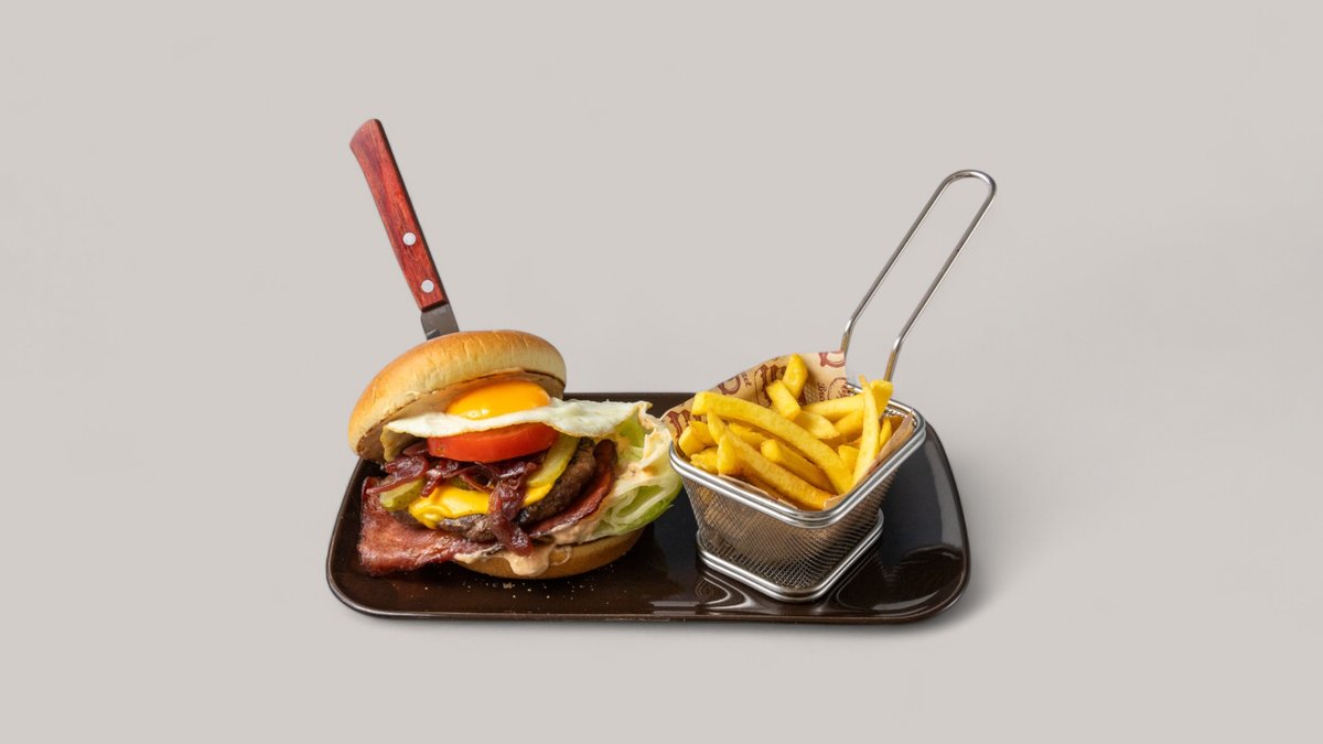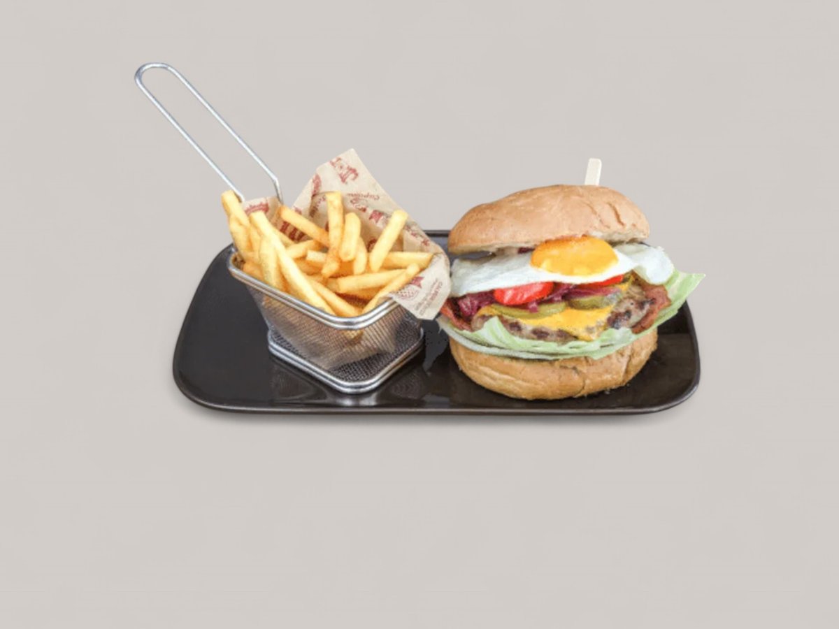 телешки бъргър от прясно смляно българско месо, чедър, хрупкав бекон, карамелизиран червен лук, кисела краставичка, домат, айсберг, нашият специален бургер сос, пържени картофки.