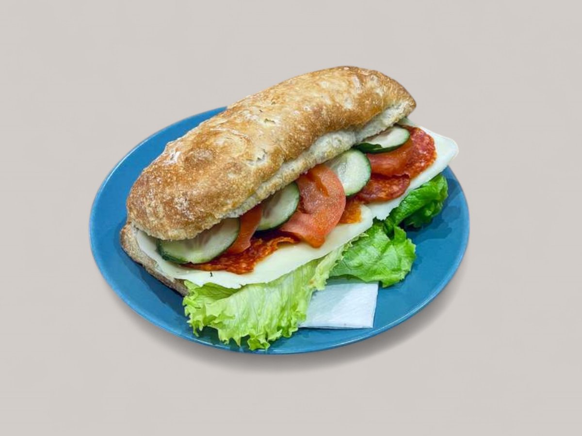 1/2 чиабата намазана с топено сирене, луканка, кашкавал. 160гр.