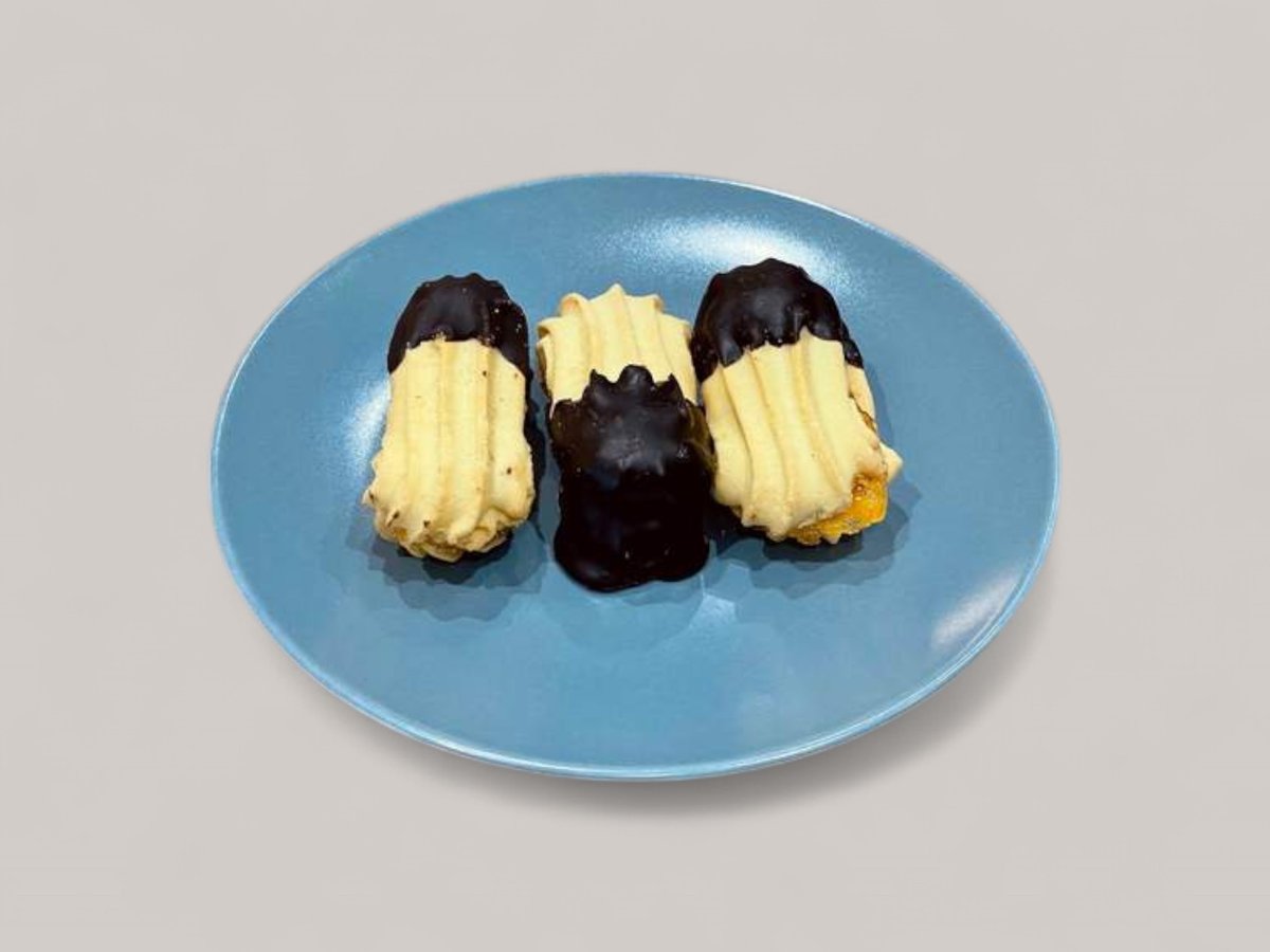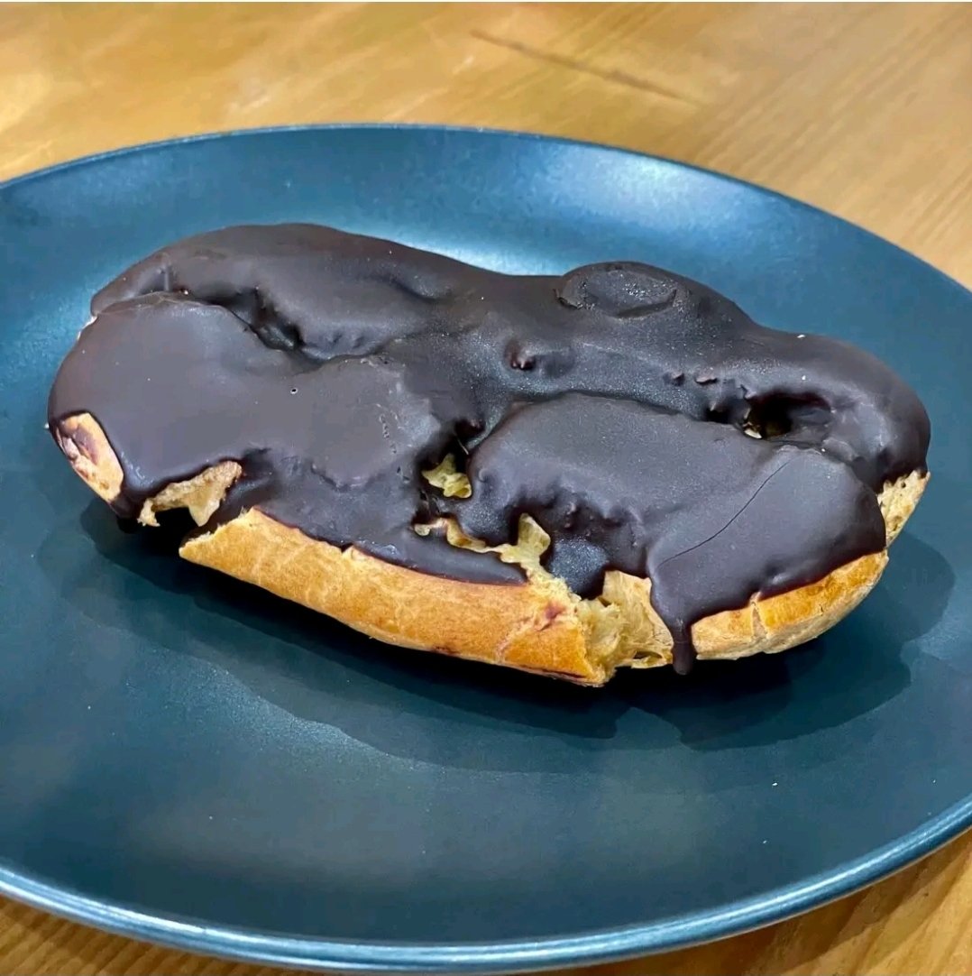яйца, захар, брашно, масло, какао, сметана, малки домашни еклери, крема сирене, сладко от вишни и течен шоколад