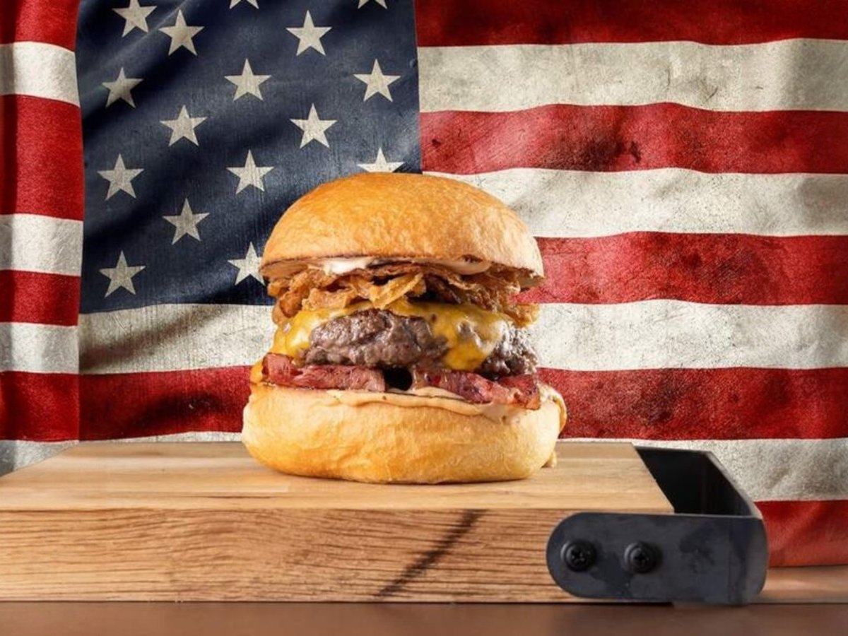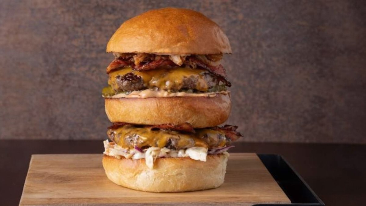 домашна бриош питка запечена с масло, американски бургер сос с кисела краставичка, пати от говеждо мляно месо Black Angus 2 броя х 160г, грилован пушен бекон 4 броя, червен Чедър сирене, колсло, кисела краставичка, хрупкав лук 630г