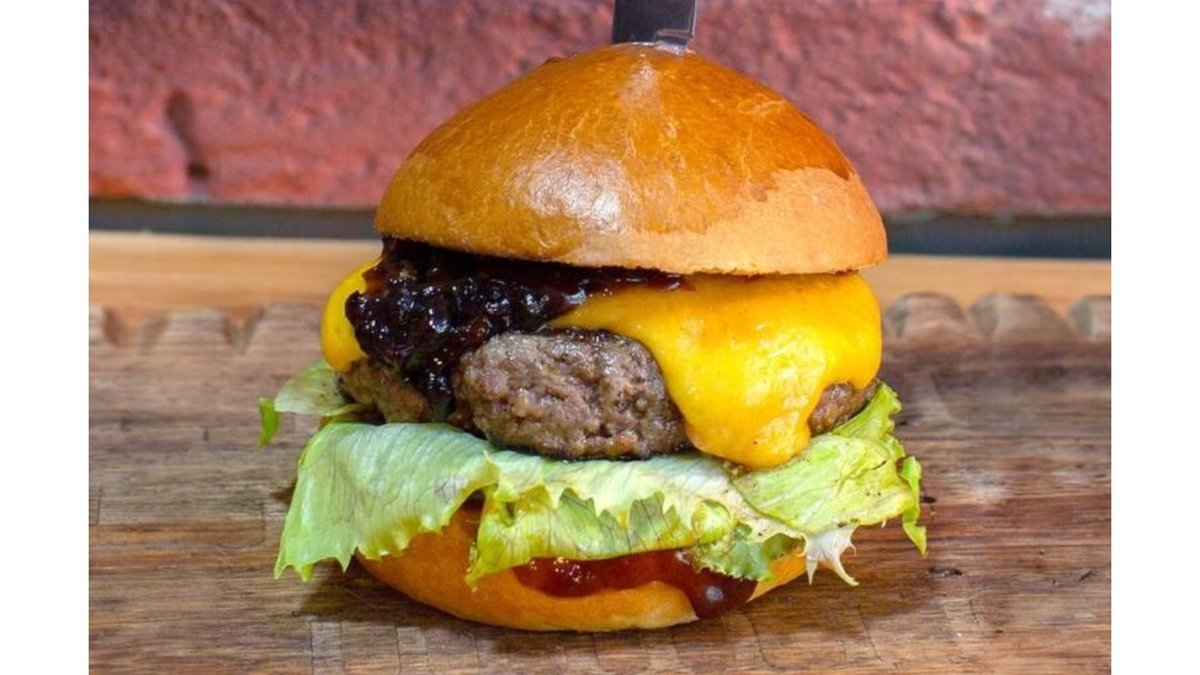 домашна бриош питка запечена с масло, барбекю сос, хрупкав айсберг, пати от говеждо мляно месо Блек Ангъс 200г, червен Чедър сирене, конфитюр от бекон и кайсия, слайс домат 430г