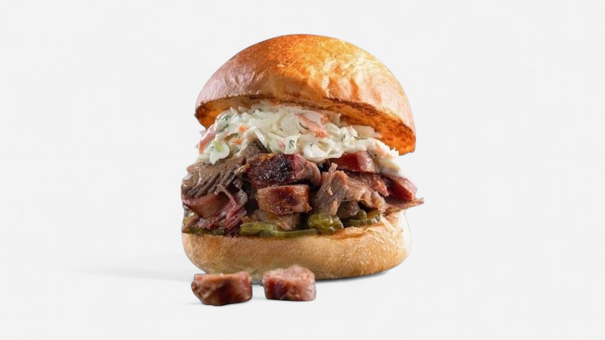 домашна бриош питка запечена с масло, бавно пушени говежди гърди (брискет) Блек Ангъс, пушена свинска наденичка, салата колсло, кисела краставичка и домашен барбекю сос 450г