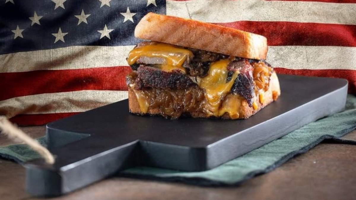 домашен американски хляб запечен с масло, бавно пушени говежди гърди (брискет) Блек Ангъс, карамелизиран лук, разтопен ирландски Чедър сирене 2 броя, домашен барбекю сос 350г