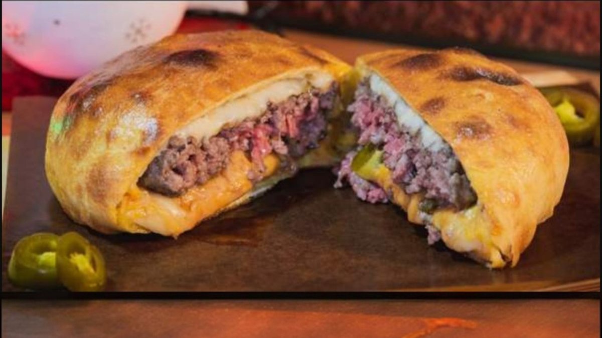 пати от говеждо мляно месо от породата Black Angus 200г, крема сирене Philadelphia, моцарела, Чедър сирене, халапеньос, завито в тесто по наша рецепта и намазано с масло, приготвено в керамично барбекю Big Green Egg на въглища от дъб и габър 400г