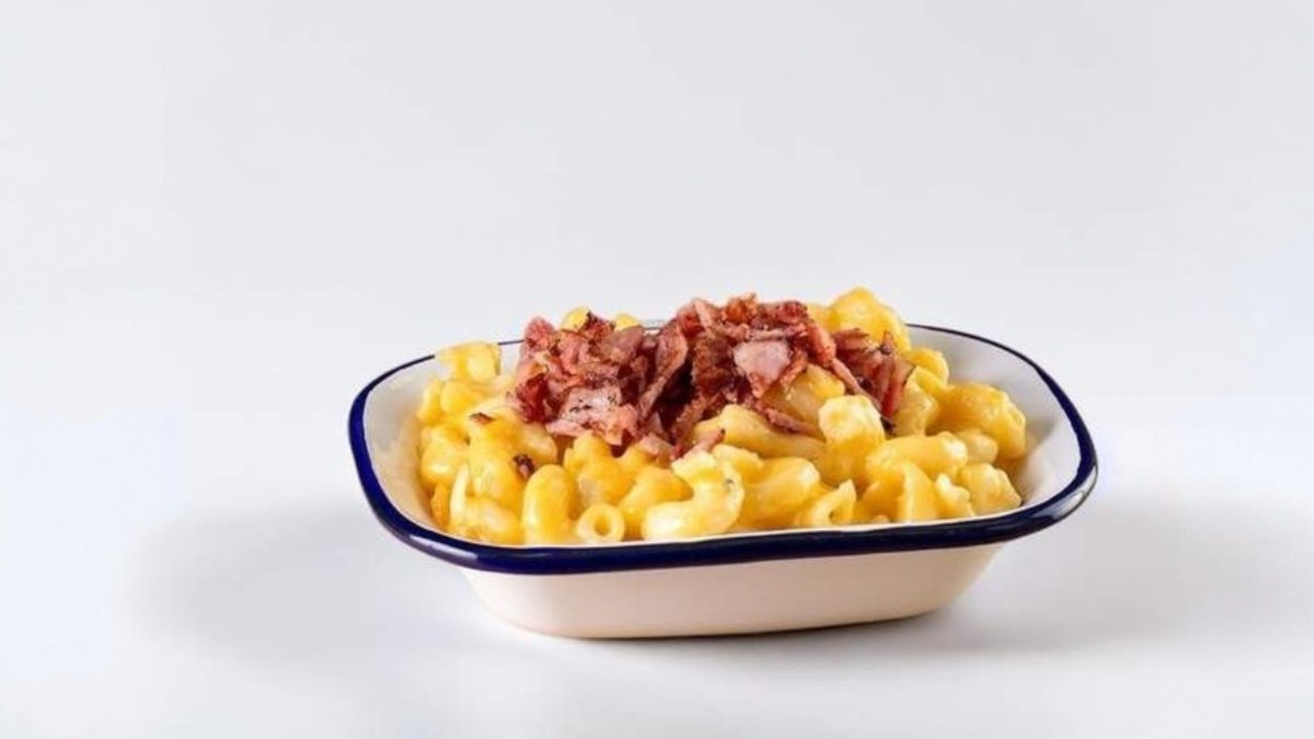Макарони с разтопени сирена Чедър, Грюер и Фонтина, мляко,масло, зехтин,брашно,пушен червен пипер,кайенски пипер и черен пипер.Поръсено с чеснова галета с червен пипер и олио. 220гр