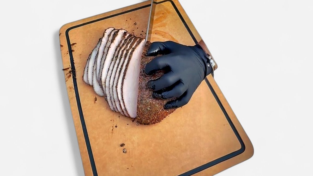 бавно пушени говежди гърди (брискет) овкусени със сол, черен пипер и аромат на ябълково дърво, сервира се с картофено пюре, подправено с див лук 200г