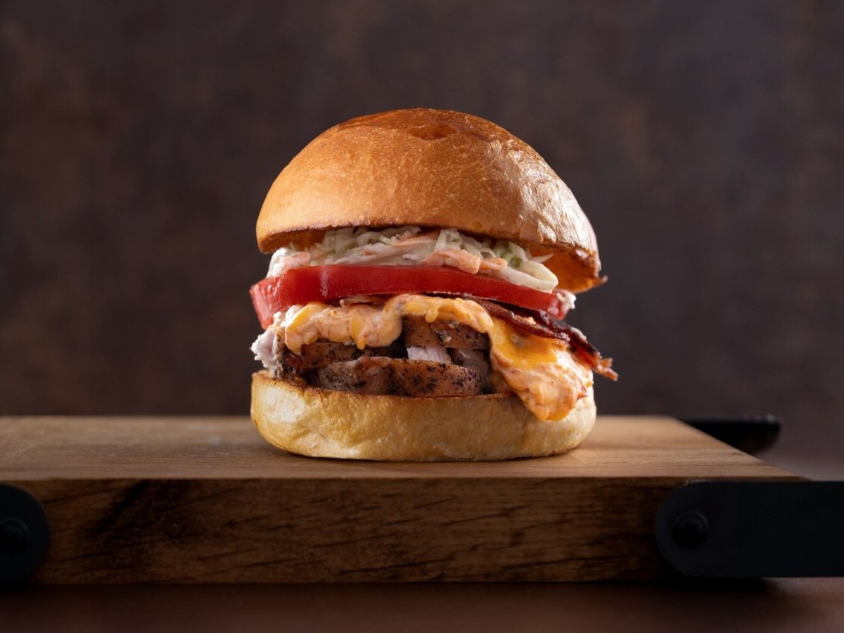 домашна бриош питка запечена с масло, бавно пуешки гърди, хрупкав бекон, Pimento cheese (чедър, майонеза, крема сирене "Philadelphia", маринова червена чушка, срирача чили сос), домат и салата Колсло, 350г