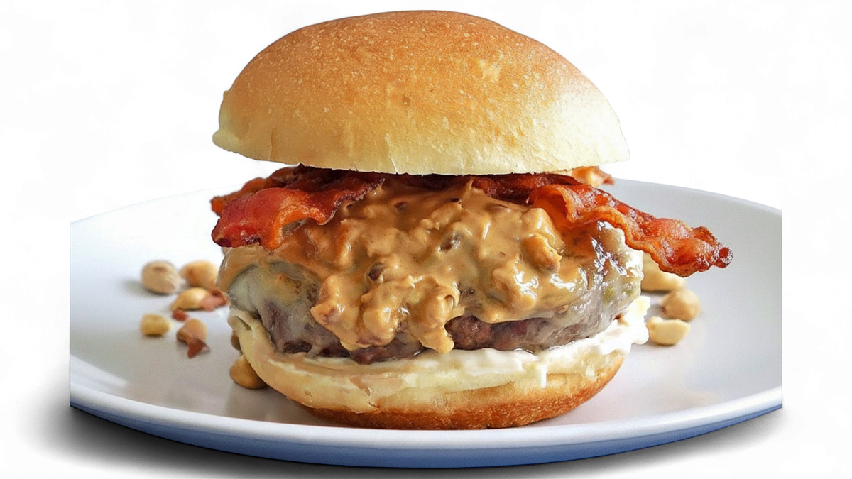 Домашна бриош питка запечена с масло, майонеза, 160гр говеждо мляно месо Блек Ангъс, хрупкав бекон, крънчи фъстъчено масло, домашно сладко от ябълка и разтопен чедър