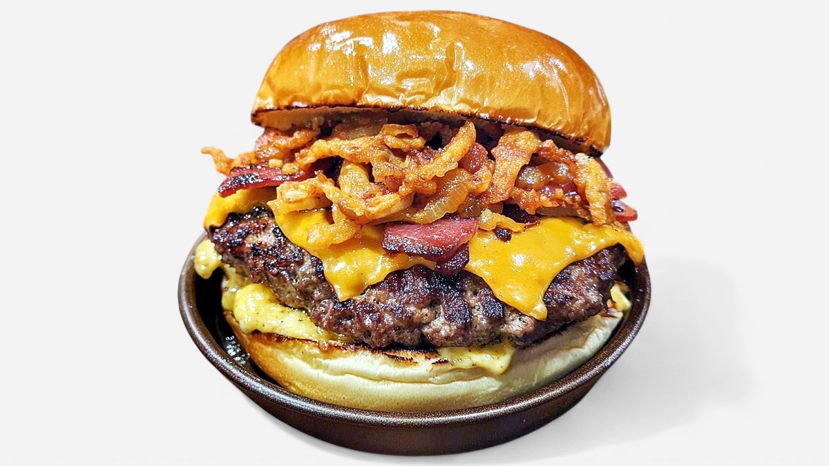 домашна бриош питка запечена с масло, бургер сос с кисела краставичка, пати от говеждо мляно месо Блек Ангъс 200г с топящо се ядро от червен Чедър сирене, пушен бекон, хрупкав лук 330г