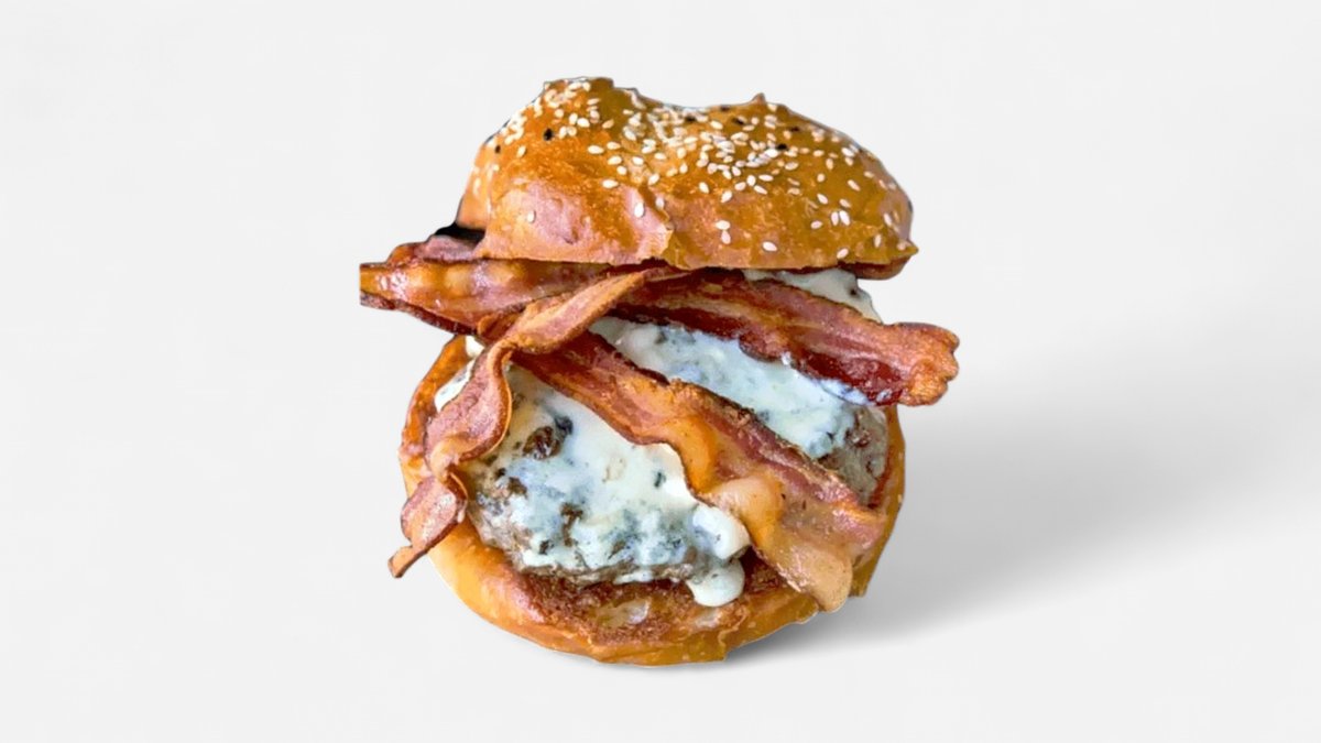 домашна бриош питка запечена с масло, барбекю сос, кисела краставичка, пати от говеждо мляно месо Блек Ангъс с топящо се ядро от синьо сирене 280г, Чедър сирене и моцарела, пушен бекон, грилован лук с Уорчестър и подправки 480г