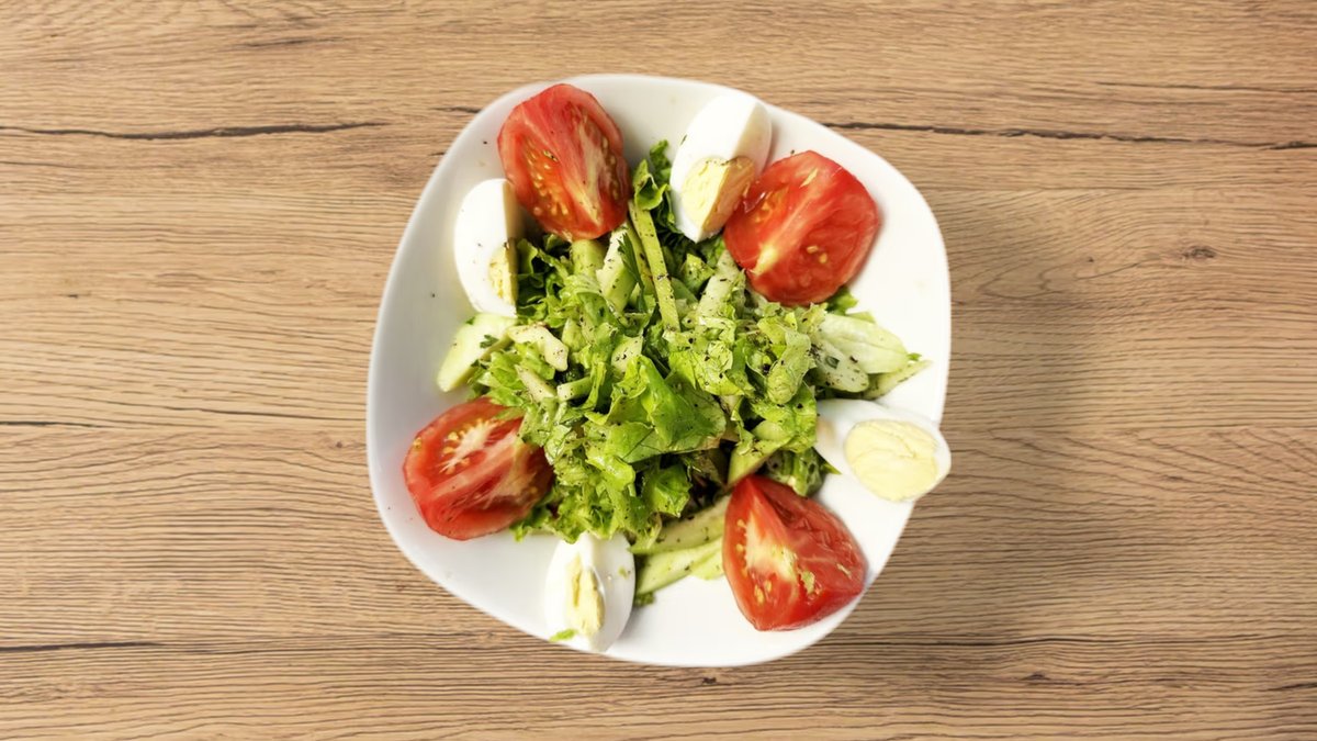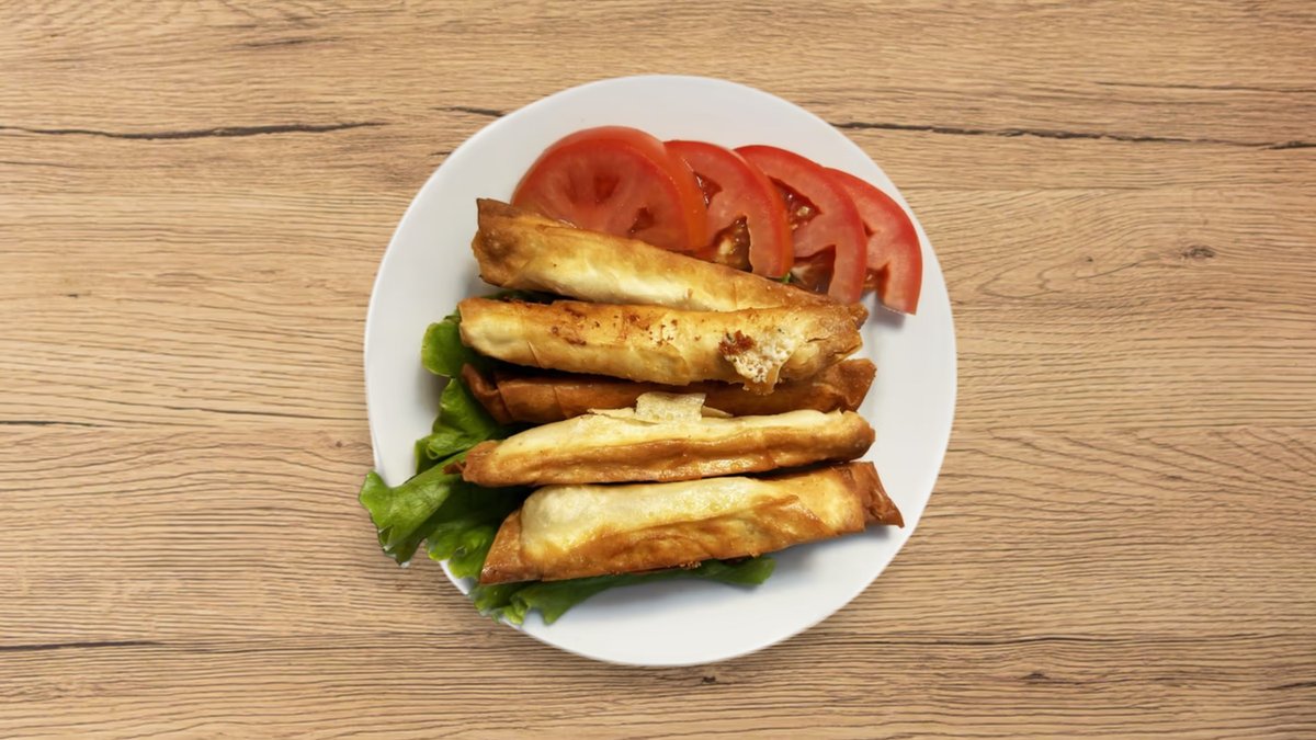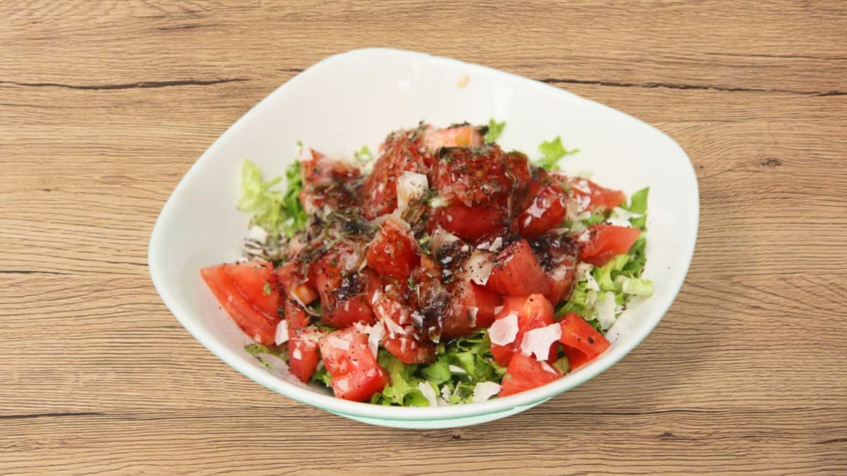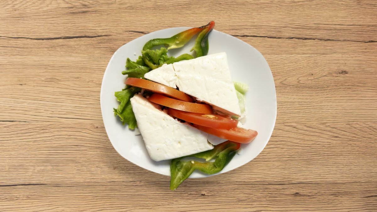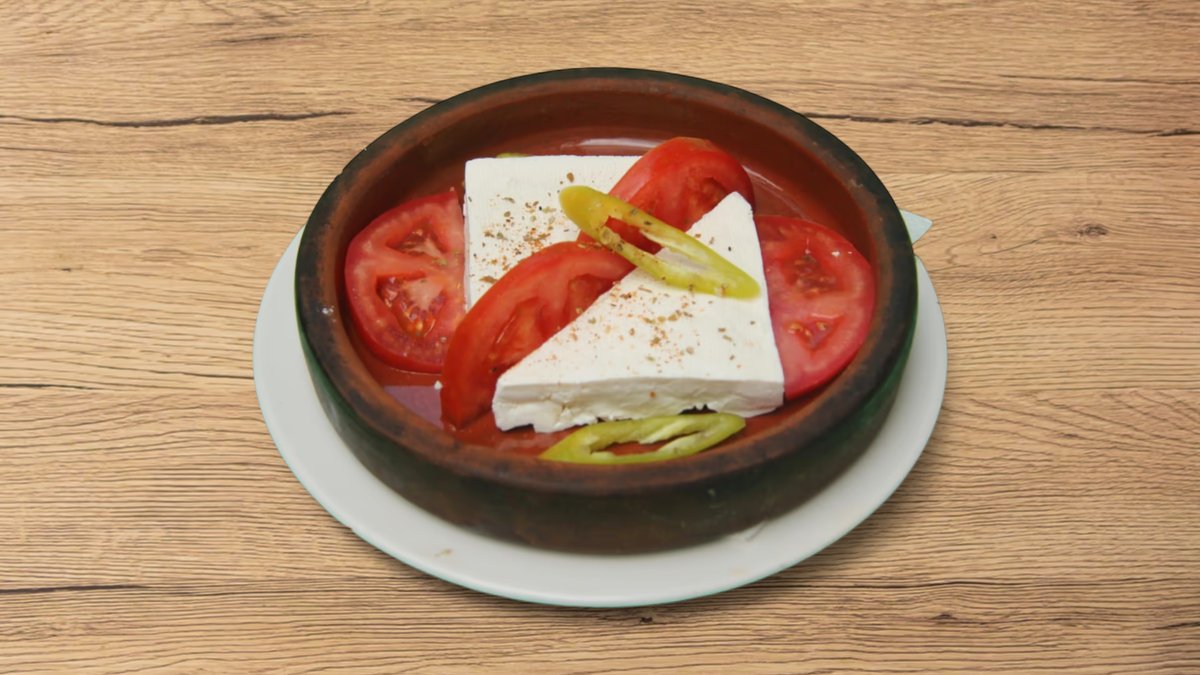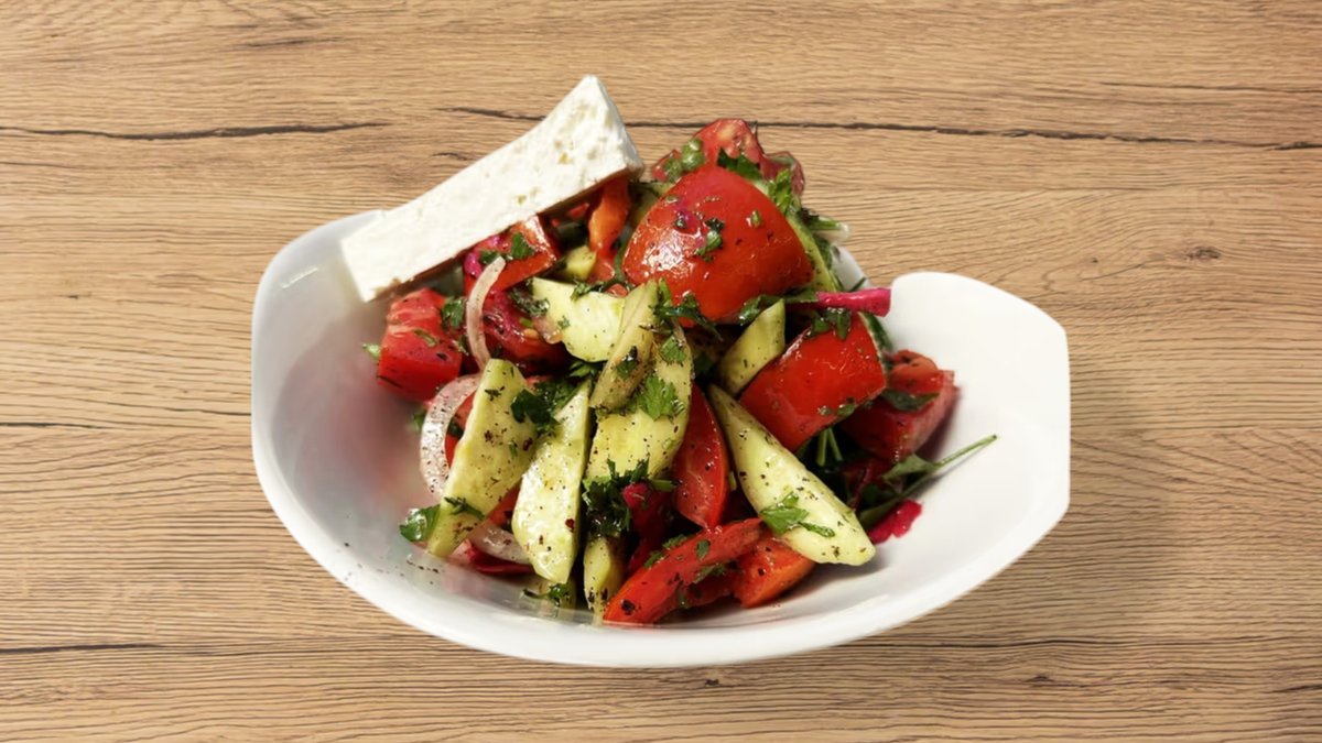 Домати, краставици, лук, магданоз, турски подправки и плочка сирене
