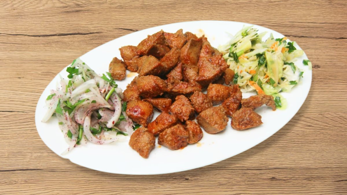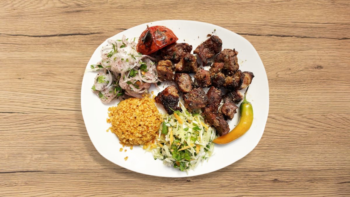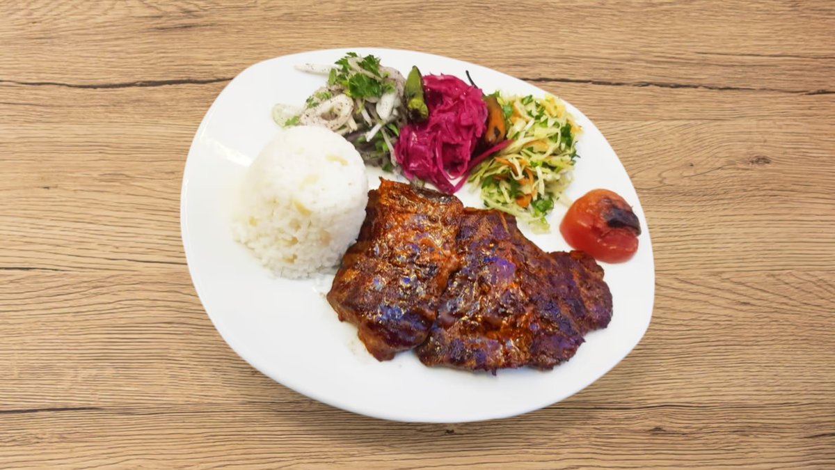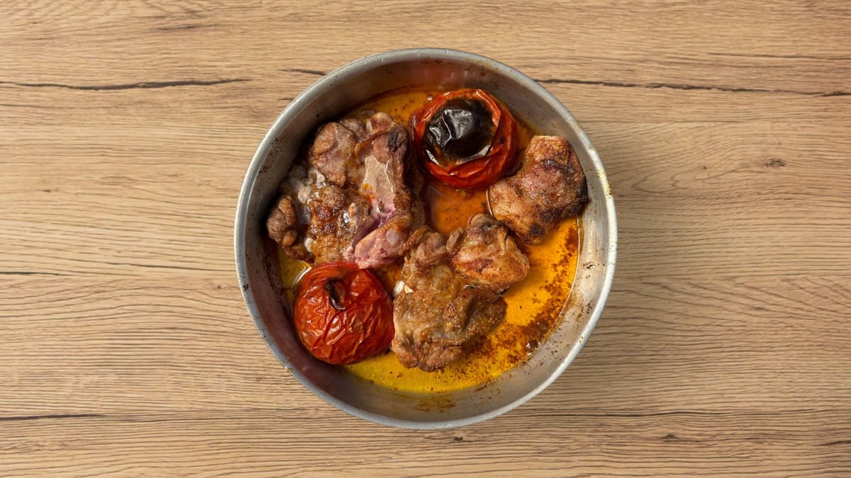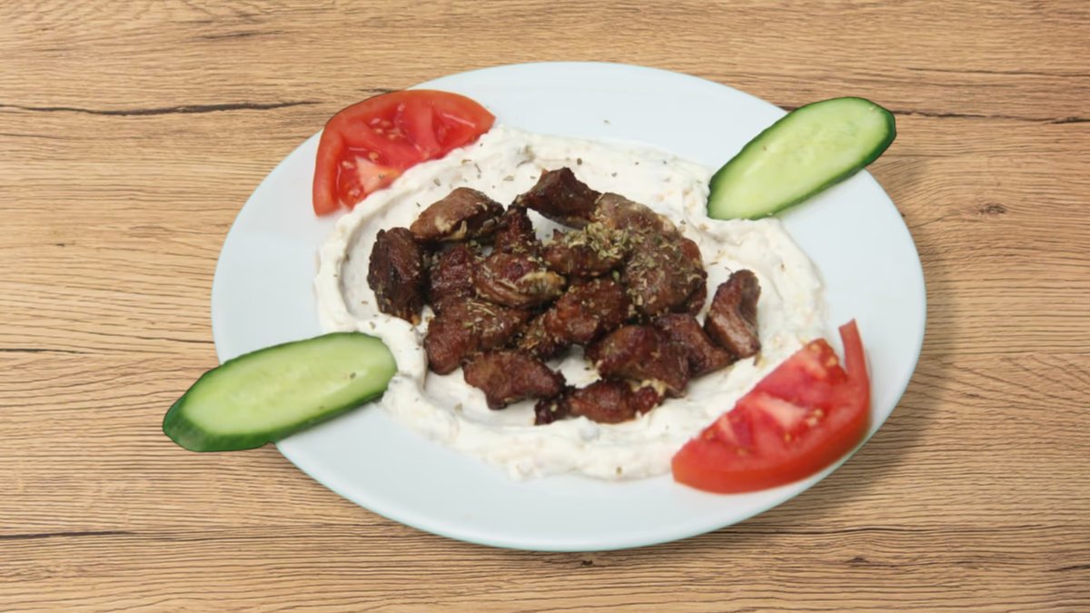Телешко месо бут, агнешки бут, червени чушки, патладжани, цедено кисело мляко, чесън, подправки 350г