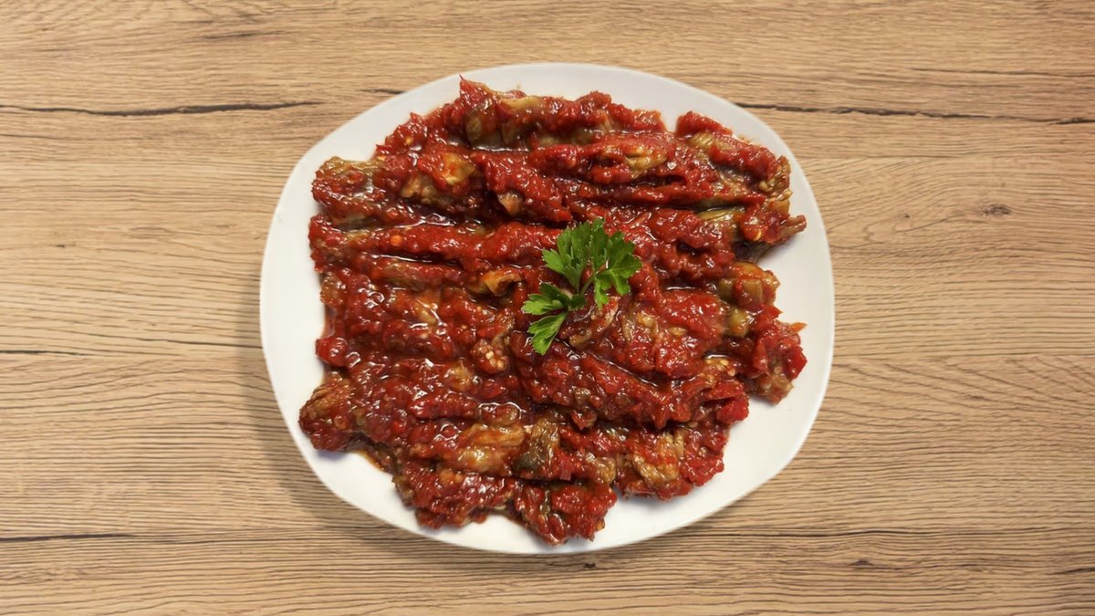 Пържен патладжан, доматен сос, чесън, подправки 300г